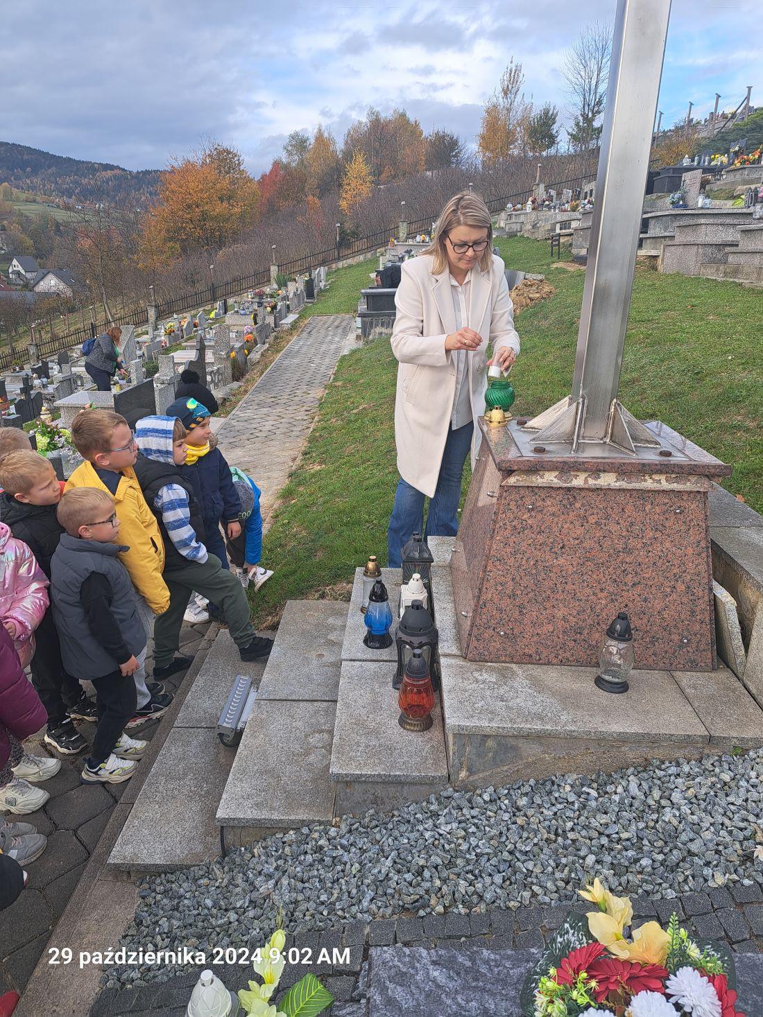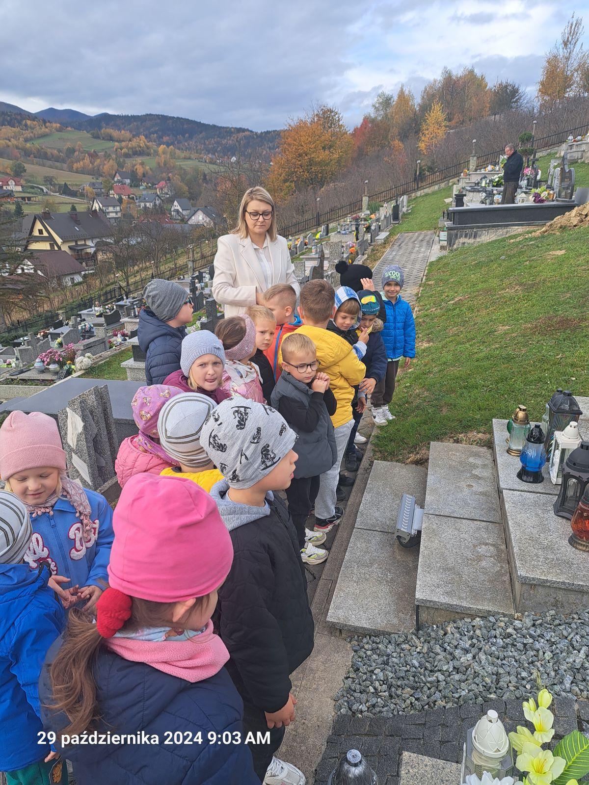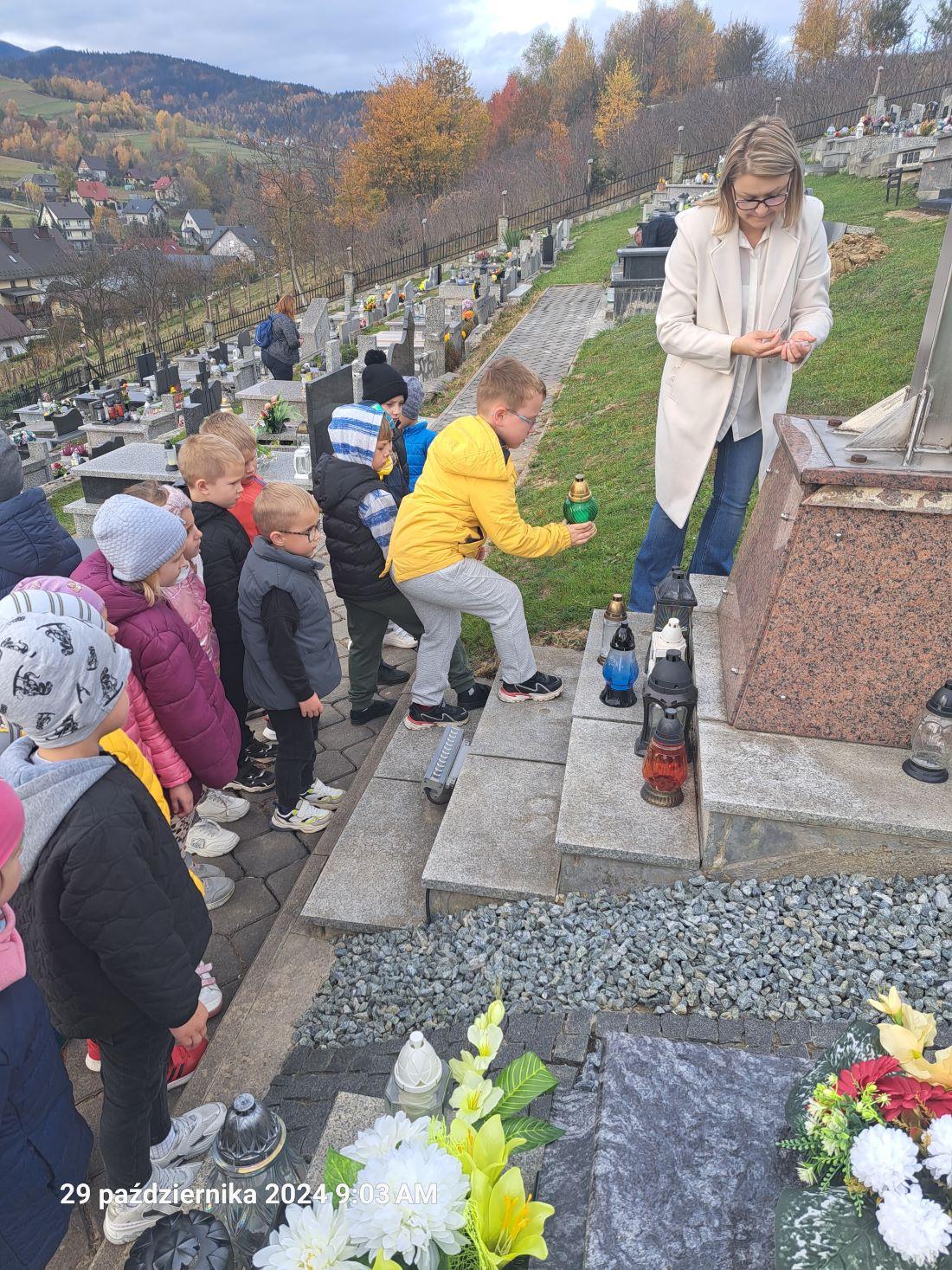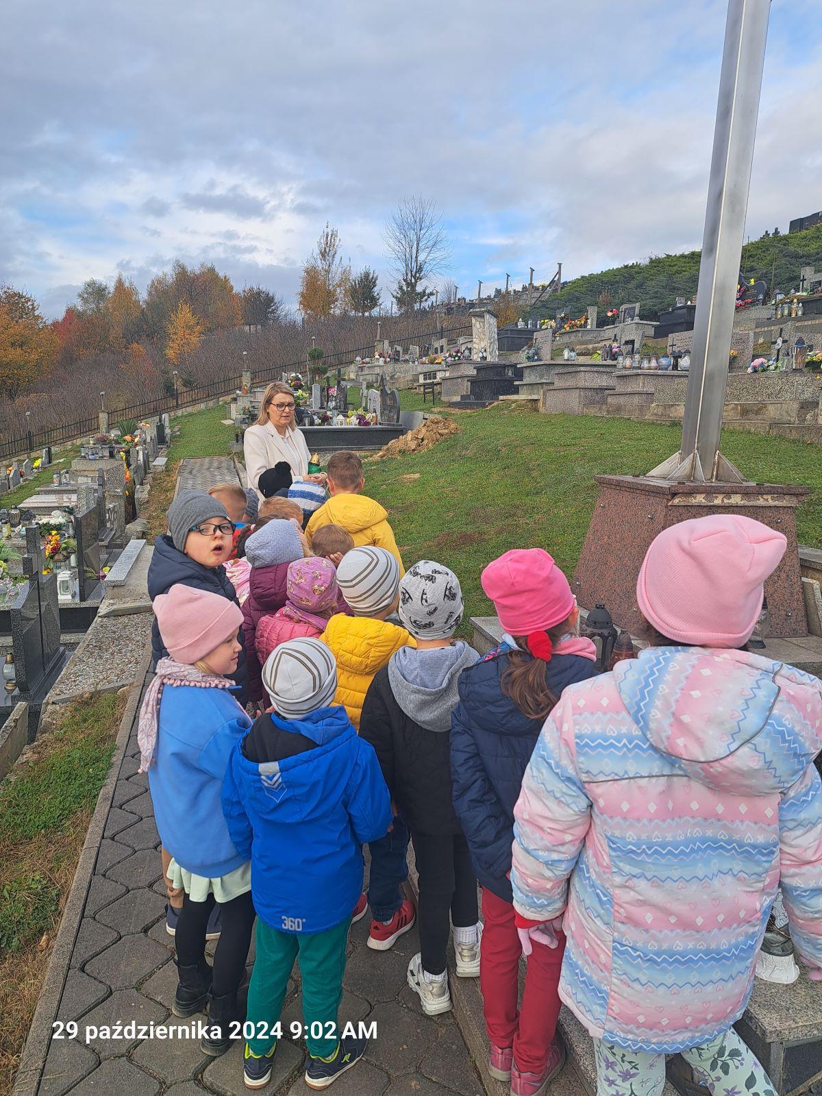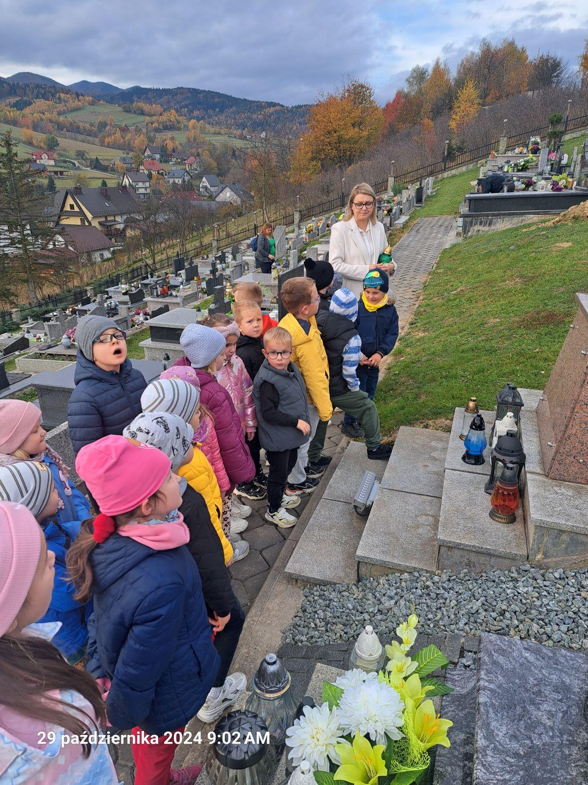 Miesiąc listopad to czas zadumy, refleksji i pamięci o osobach zmarłych. Pamięć o zmarłych jest obowiązkiem każdego człowieka. Wprowadzając dzieci w świat wartości społeczno-moralnych oddziały przedszkolne i klasy 1-3 w tygodniu poprzedzającym Święto Zmarłych odwiedzały miejscowy cmentarz. W czasie spaceru dzieci poznawały tradycje, zwyczaje związane ze świętem zmarłych w naszej kulturze i religii. Została również zwrócona uwaga na to, jak należy zachowywać się na cmentarzu, by nie zakłócać spokoju zmarłych i osób odwiedzających to miejsce.
