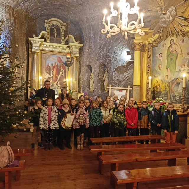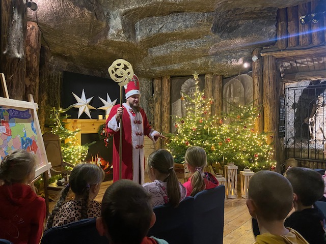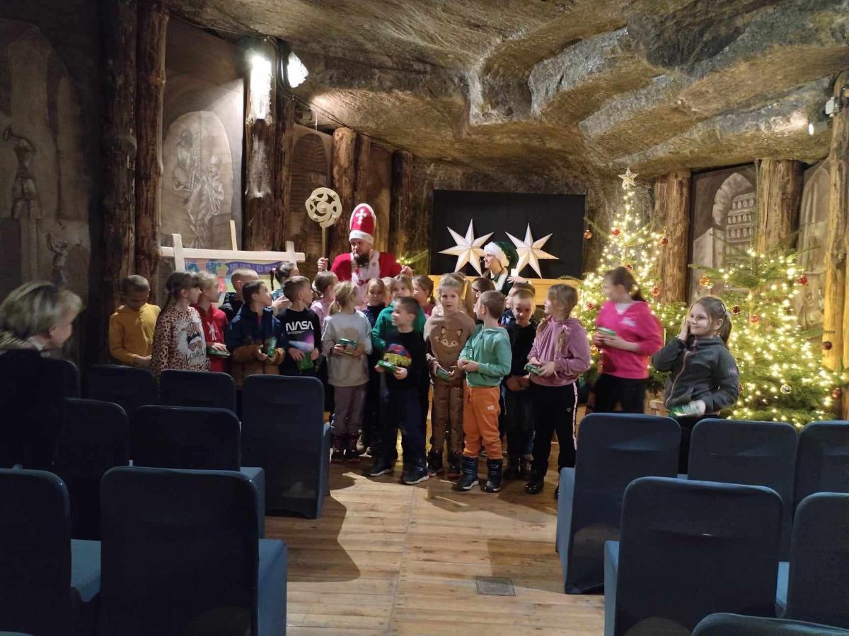 2 grudnia 2024 r. dzieci otrzymały list od Św. Mikołaja, z którego dowiedziały się, że w prezencie mikołajkowym otrzymały bilet wstępu do Kopalni Soli w Bochni. Mikołaj prosił, aby dzieci uważnie słuchały przewodnika, zapamiętały jak najwięcej informacji na temat kopalni, jej historii oraz jej bogactwie - soli. Zwrócił również uwagę, że jeżeli dzieci będą bardzo uważnie obserwować trasę, to znajdą wskazówki, które pozwolą odnaleźć jego worek na prezenty i może się z Mikołajem spotkają. Wycieczka była pełna emocji i wielu ciekawych wrażeń. Dzieci z zainteresowaniem słuchały Pana Przewodnika, zadawały mu pytania oraz wykazywały się dużą wiedzą. Pan przewodnik bardzo ich chwalił. Dzieci również odnalazły wszystkie wskazówki i spotkały się ze Św. Mikołajem. Po opuszczeniu kopalni, słoneczna pogoda zachęciła dzieci do spaceru po Bochni.