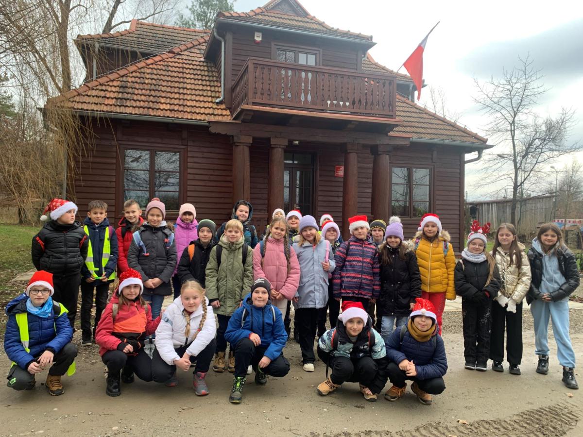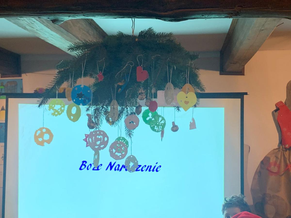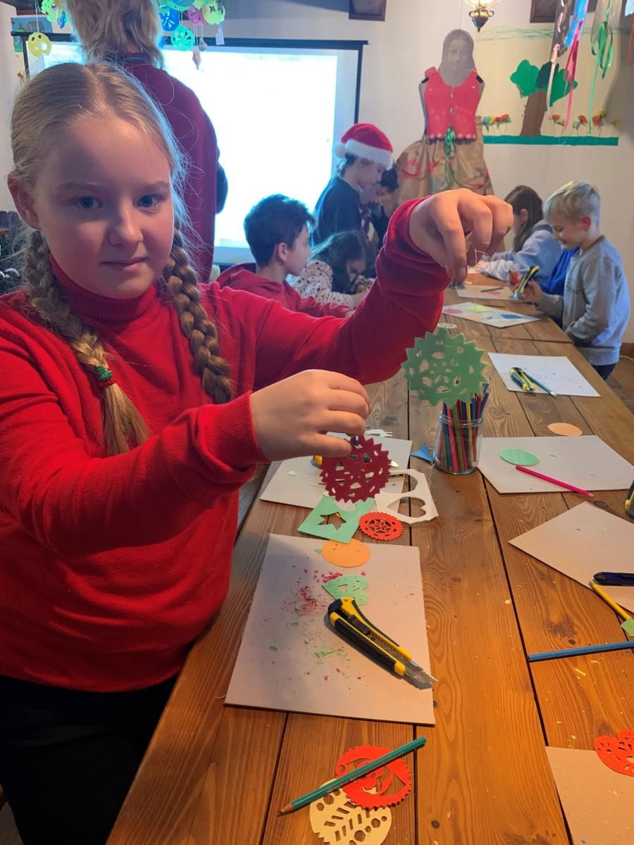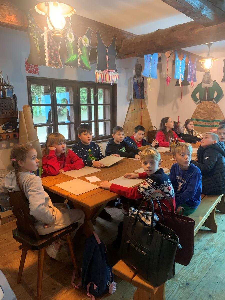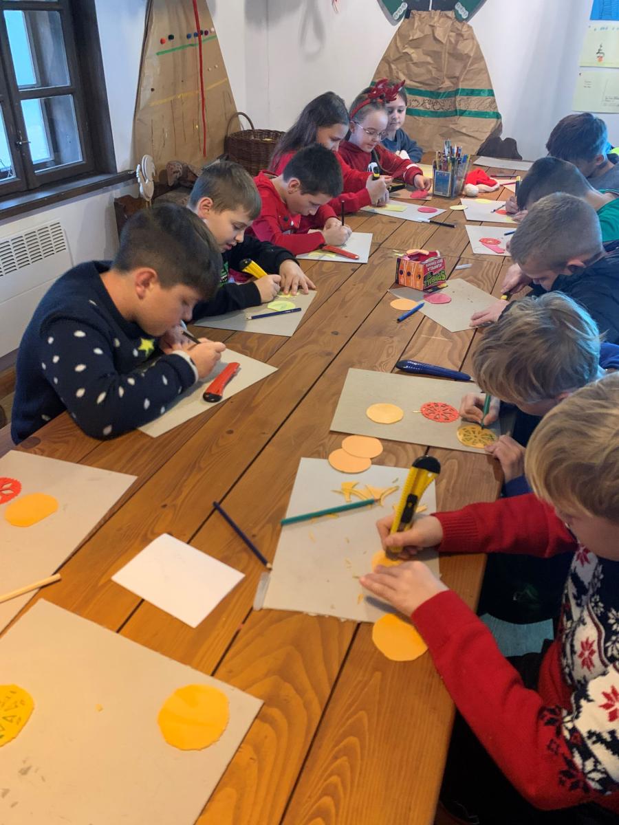 Następnie uczniowie pojechali do Sądeckiego Parku Etnograficznego, który znajduje się na terenie dawnej wsi Falkowa. W jednym z budynku Skansenu dzieci wzięły udział w „Warsztatach ozdób bożonarodzeniowych”. Panie przy pomocy prezentacji przybliżyły dzieciom jaką rolę pełniła dawniej podłaźniczka i jak się ją ozdabiało. Dzieci bardzo precyzyjnie wycinały z opłatków wzory, by później ich praca zdobiła zawieszoną u sufitu ozdobę.