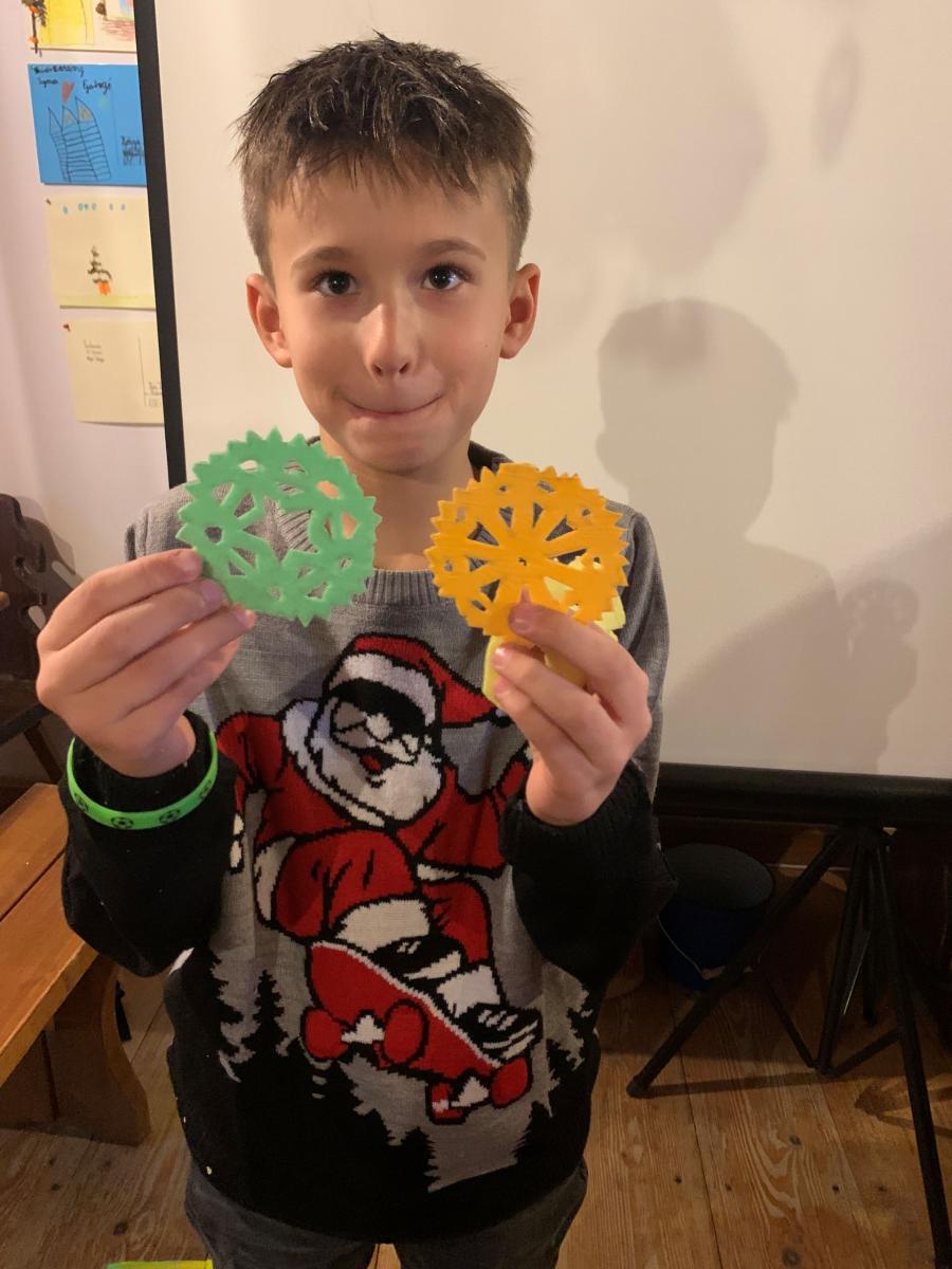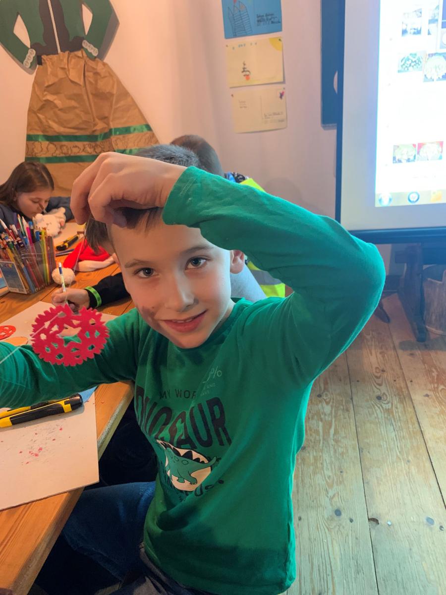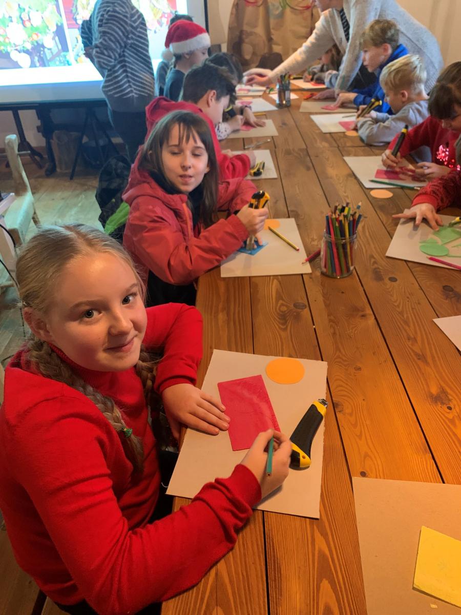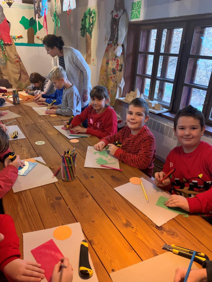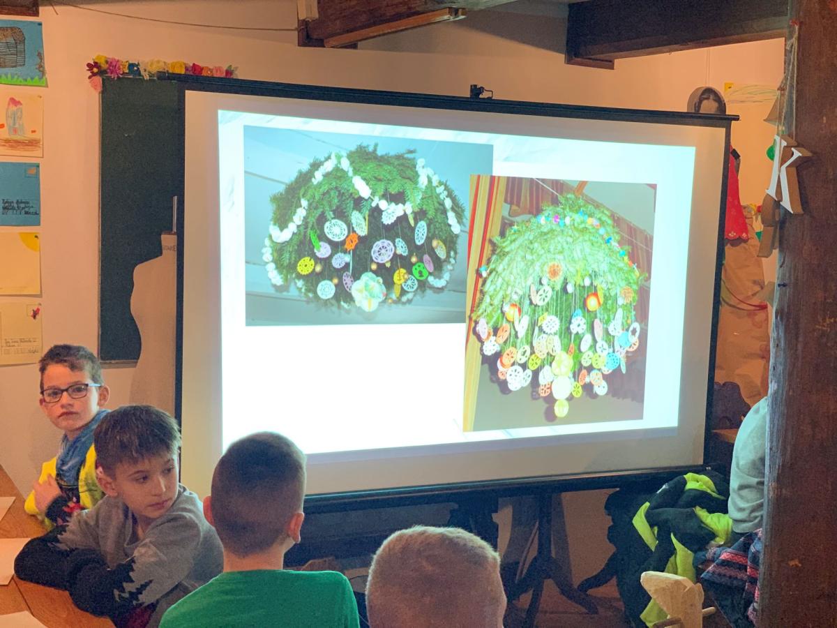 Następnie uczniowie pojechali do Sądeckiego Parku Etnograficznego, który znajduje się na terenie dawnej wsi Falkowa. W jednym z budynku Skansenu dzieci wzięły udział w „Warsztatach ozdób bożonarodzeniowych”. Panie przy pomocy prezentacji przybliżyły dzieciom jaką rolę pełniła dawniej podłaźniczka i jak się ją ozdabiało. Dzieci bardzo precyzyjnie wycinały z opłatków wzory, by później ich praca zdobiła zawieszoną u sufitu ozdobę.