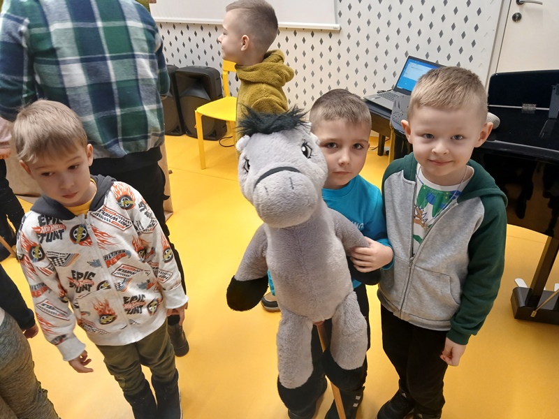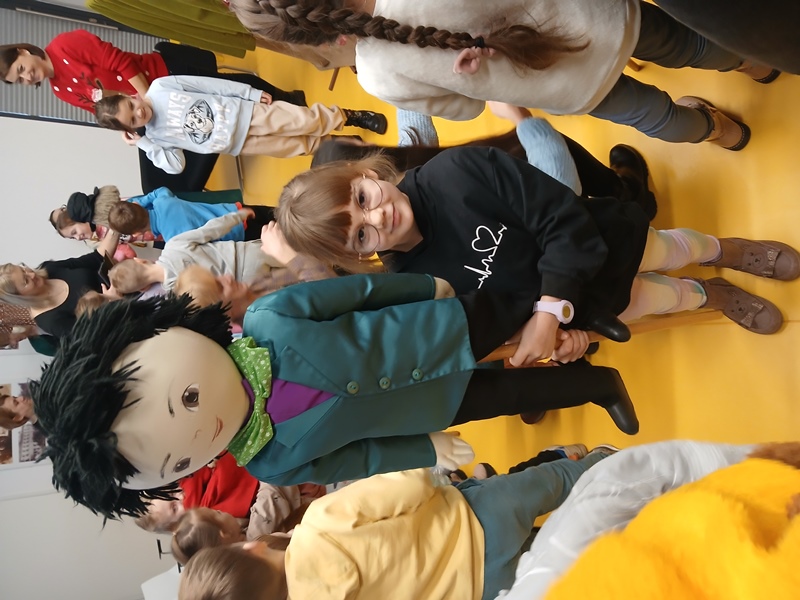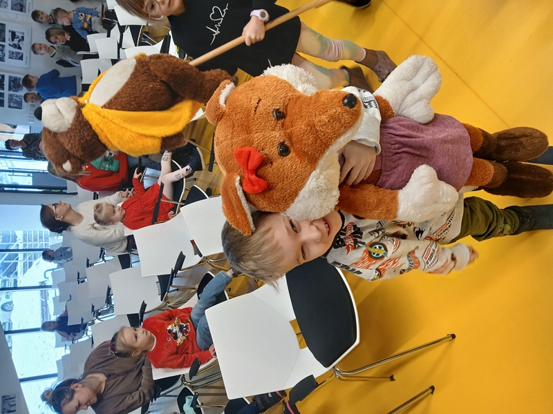 Po krótkim przywitaniu, dzieci z ogromnym zaciekawieniem obejrzały piękne przedstawienie. Później miały okazję przyjrzeć się kukiełkom z bliska. Dzieci mogły dotknąć, a nawet przytulić lalki. Chętnie korzystały z tej możliwości, co dało im jeszcze więcej śmiechu i radości.