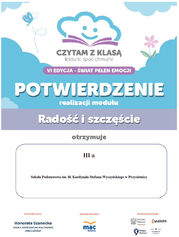 Uczniowie klasy 3a z zapałem przystąpili po raz drugi do realizacji Międzynarodowego Projektu Edukacyjnego wspierającego rozwój czytelnictwa - CZYTAM Z KLASĄ – lekturki spod chmurki” VI edycja pod kryptonimem ŚWIAT EMOCJI.