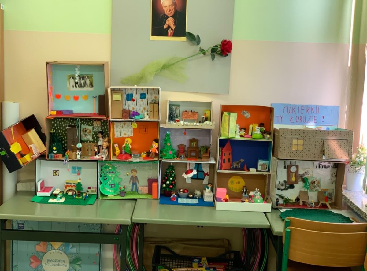 - Samodzielnie wykonali trójwymiarowy model wybranej sceny. Połączyli wyposażone pokoje, garaże, ogrodzenia w całość tworząc ciekawą ekspozycję, która zdobiła salę.