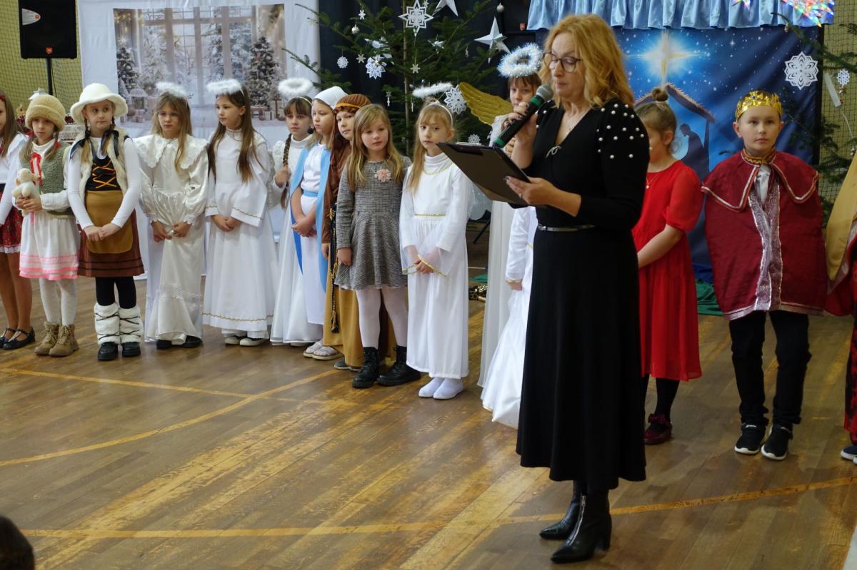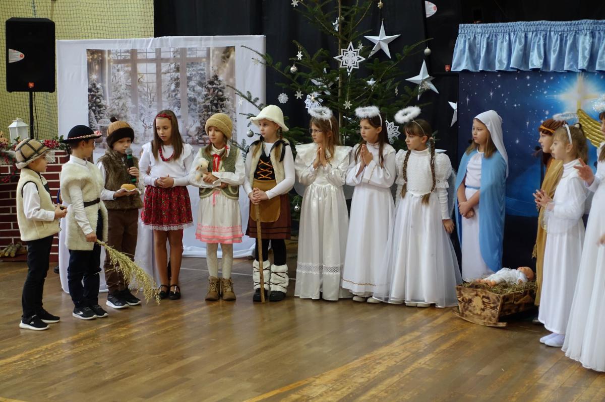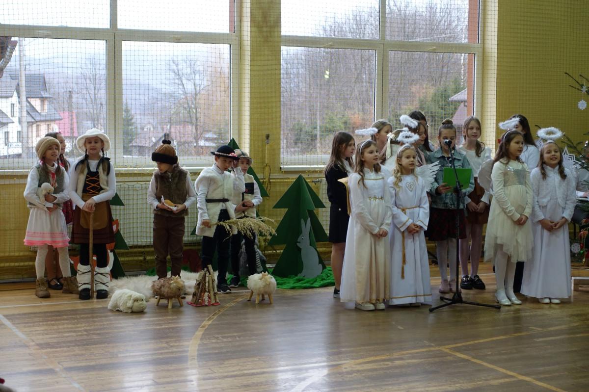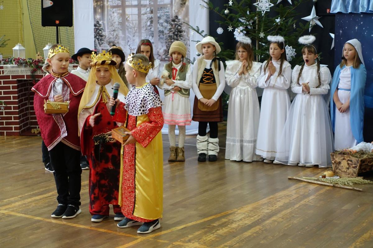 Po wspólnym posiłku społeczność naszej szkoły uczestniczyła w Jasełkach, przygotowanych przez uczniów klasy drugiej pod kierunkiem p. Barbary Stelmach. Wspaniała scenografia, piękne kostiumy oraz poruszające kolędy i pastorałki sprawiły, że wszyscy czuli się częścią tej pięknej opowieści. Uczniowie poprzez udział w tym wydarzeniu mieli szansę na refleksję nad istotą świąt, wartościami takimi jak miłość, pokój i empatia.