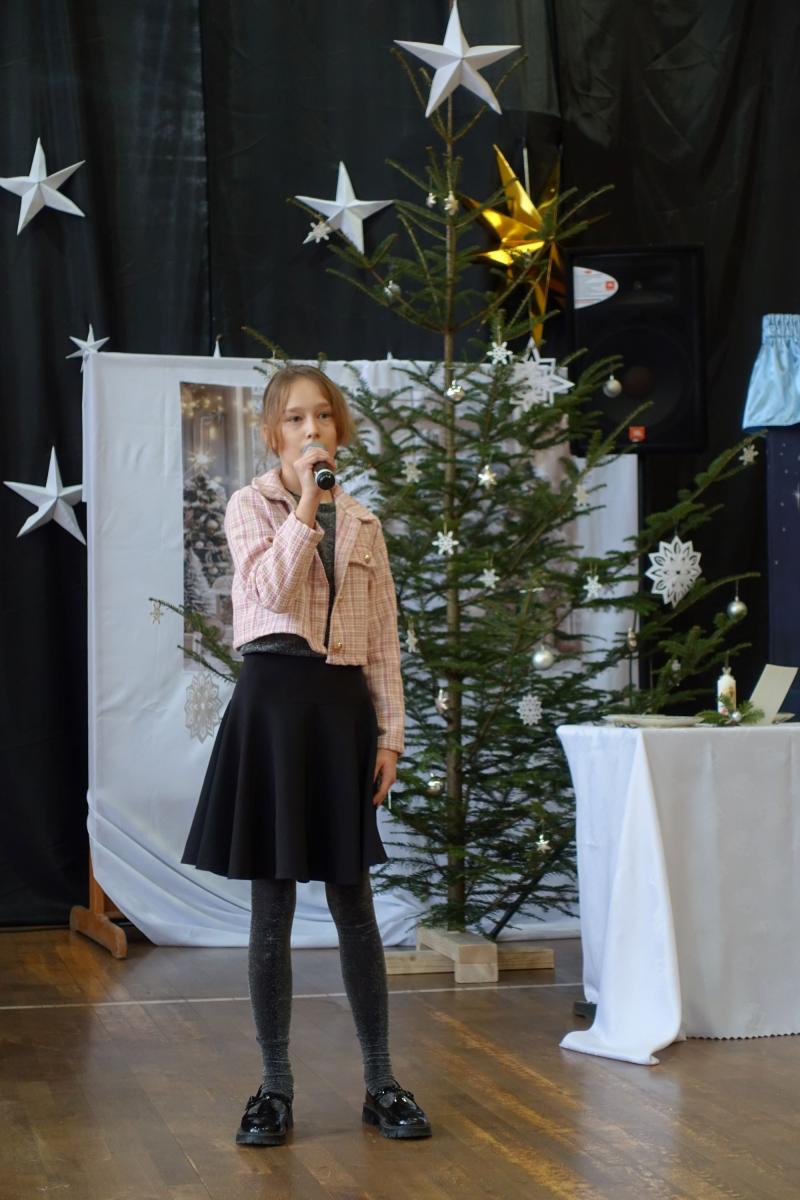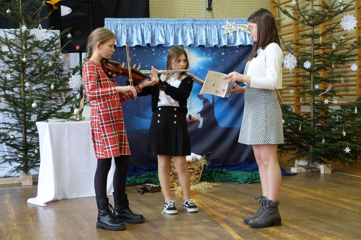 Kolejnym punktem świątecznego programu była prezentacja wybranych utworów wokalnych i instrumentalnych z organizowanego w naszej szkole Konkursu Kolęd i Pastorałek. Uczniowie wykonali piękne, wzruszające utwory, które dotknęły serc wszystkich obecnych. Wspólne kolędowanie to nie tylko tradycja, ale także sposób na budowanie więzi między uczniami, nauczycielami i rodzicami.