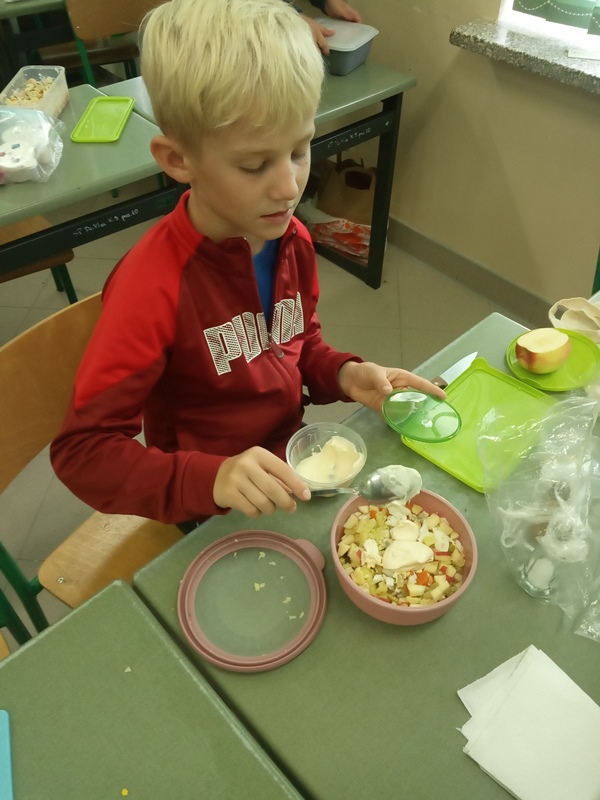 W ramach realizacji zadań tego projektu uczniowie uczestniczyli w zajęciach „Jesteśmy ty, co jemy”, podczas których klasyfikowali posiłki pod kątem zdrowia, wyrażali swoje preferencje żywieniowe, poznali zasady zdrowego stylu życia, a następnie samodzielnie przygotowali Piramidę Zdrowia i dopasowywali produkty do poszczególnych poziomów Piramidy. Odbyła się też rozmowa na temat "śmieciowego jedzenia" oraz konsekwencji zbyt częstego spożywania tego typu posiłków. Kolejny moduł pod hasłem „Talerz zdrowia” zachęcił uczniów do zaprojektowania dla siebie zdrowego posiłku. Po zapoznaniu uczniów z elementami zdrowo zbilansowanej diety wykonali pracę plastyczną "Zdrowe talerzyki”. Ponadto na zajęciach technicznych w pierwszym półroczu samodzielnie przygotowywali sałatkę jarzynową oraz zdrowe śniadanie, które miało zachęcić do spożywania nabiału i produktów mlecznych. Na zakończenie projektu uczniowie przygotowali występ dla klasy Ib oparty na wierszu Jana Brzechwy "Na straganie", aby podkreślić rolę warzyw w diecie dzieci i dorosłych. Samodzielnie wykonane stroje i dekoracja dodatkowo przyciągnęły uwagę i zainteresowanie pierwszoklasistów.
