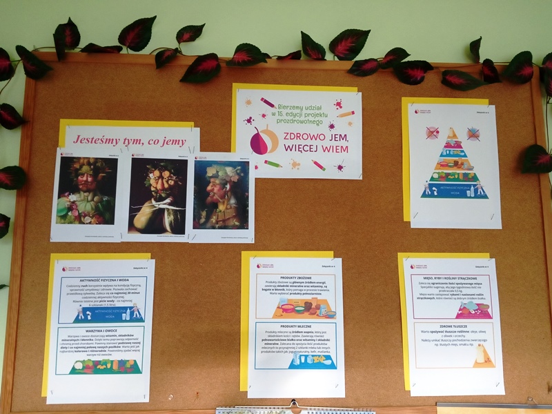 Dzięki wykonanym zadaniom uczniowie zdobyli cenną wiedzę na temat zasad zdrowego odżywiania. Zdobytą wiedzę promowali i upowszechniali w szkole poprzez wystawę swoich prac i kart pracy, gazetki szkolne czy inscenizacje. Przed nami etap wiosenny projektu – z niecierpliwością czekamy na kolejną porcję „zdrowej” wiedzy i ciekawe zadania.