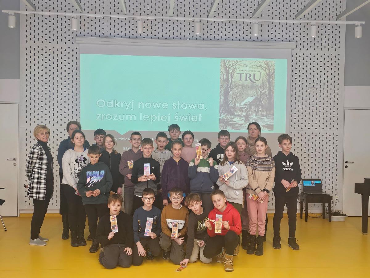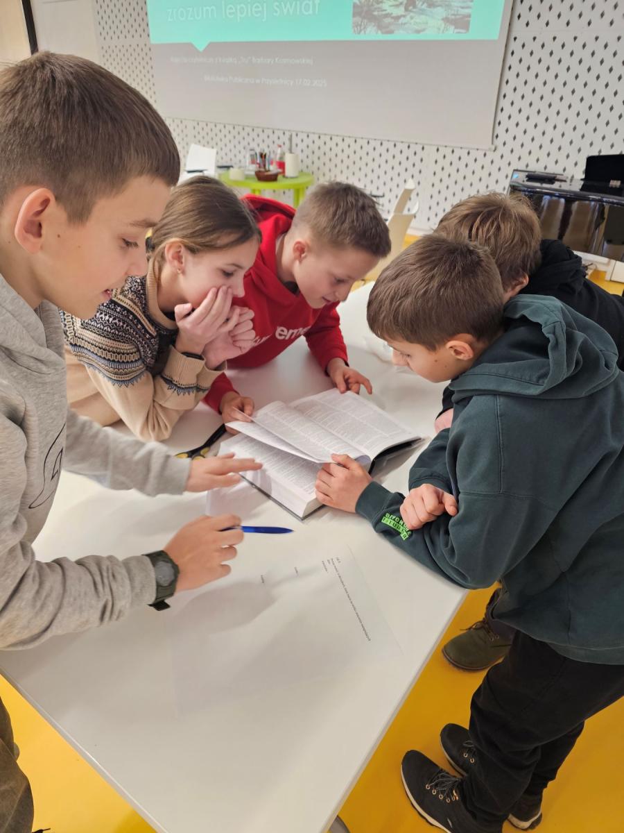 17 lutego 2025r. klasa piąta uczestniczyła w zajęciach czytelniczych zorganizowanych w Bibliotece Publicznej w Przysietnicy. Tematyka warsztatów była oparta na książce B. Kosmowskiej „Tru”. Na podstawie wspólnie czytanych tekstów dzieci szukały podobieństw z życia głównego bohatera i współczesnych ludzi. Pracując w grupach młodzi czytelnicy szukali w różnych źródłach, informacji na temat nowych lub nieznanych słów. Praca ze słownikami i encyklopediami rozwijały nie tylko umiejętności polonistyczne, ale i współpracę w grupie rówieśników. Ćwiczenia czytelnicze przeplatane zajęciami integracyjnymi pozwoliły wszystkich uczestnikom wspaniale bawić się i uczyć w niecodziennych okolicznościach. Zajęcia te z pewnością zachęcą uczniów do czytania i rozwijania tak niezbędnej umiejętności jak czytanie ze zrozumieniem.
