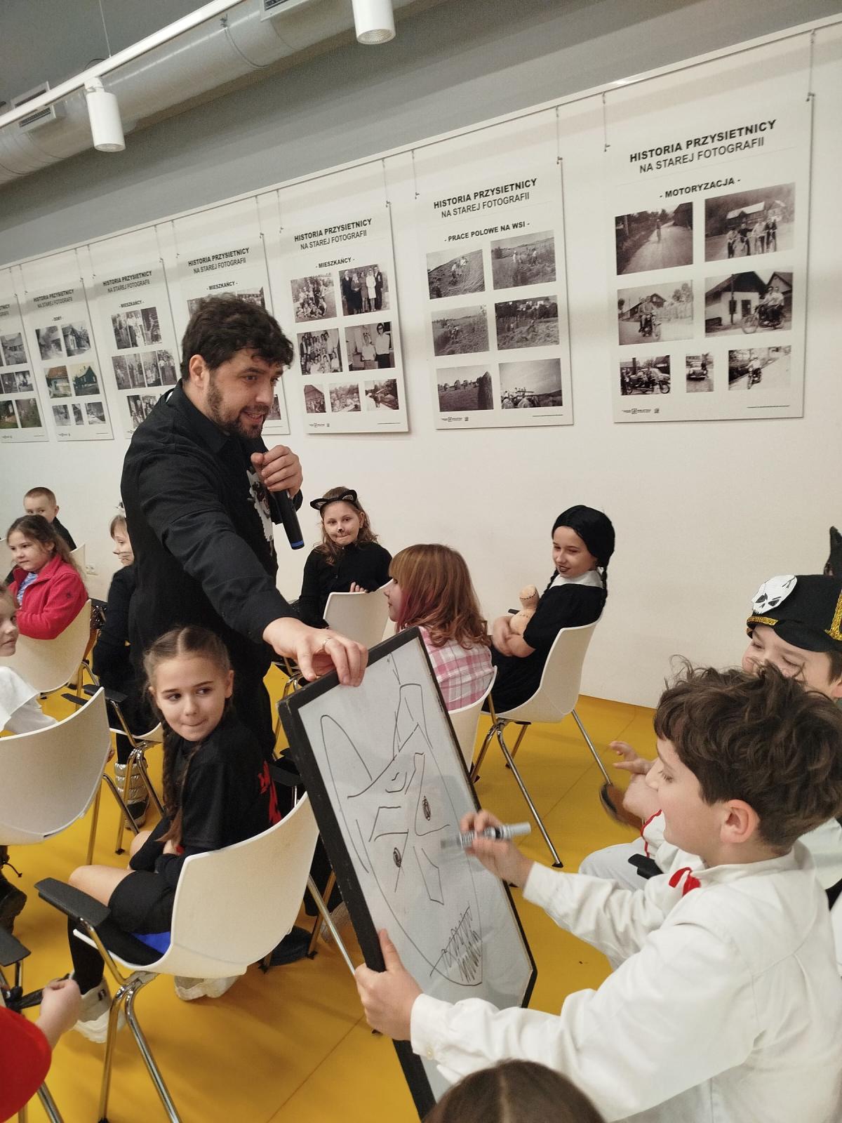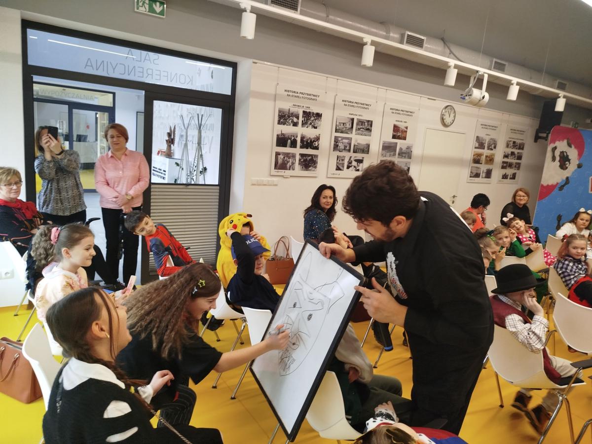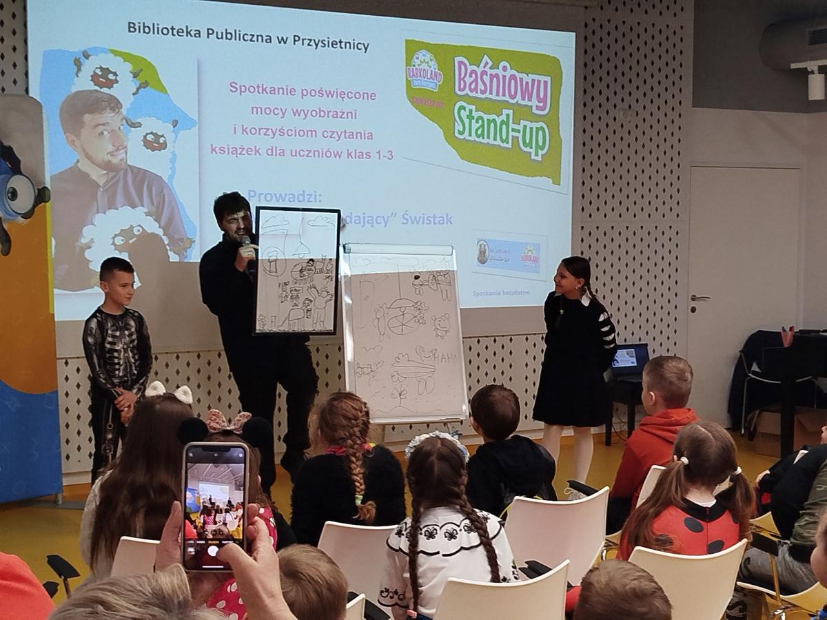 27 lutego dzieci z klas 1-3 wzięły udział w warsztatach „Baśniowy Stand-up” poświęconych mocy wyobraźni i korzyściom wynikającym z czytania książek. Warsztaty przeprowadził pan Mateusz „Gadający” Świstak, który zapoznał dzieci z procesem powstawania opowieści i skierował uwagę na książkę, jako na przedmiot dostarczający pozytywnych emocji. Z pewnością zajęcia te pobudziły wyobraźnię i kreatywność uczestników, którzy bardzo aktywnie uczestniczyli w zajęciach.
