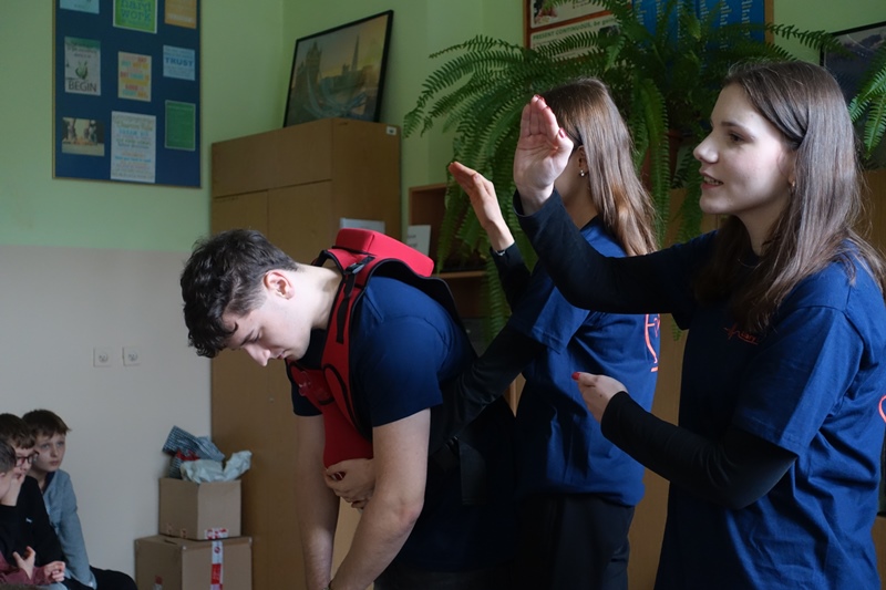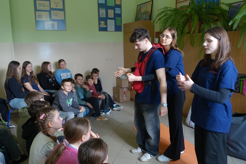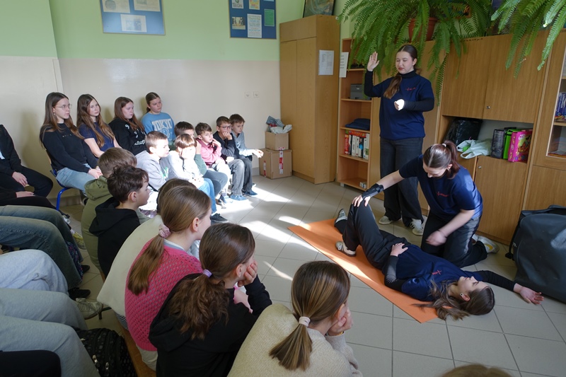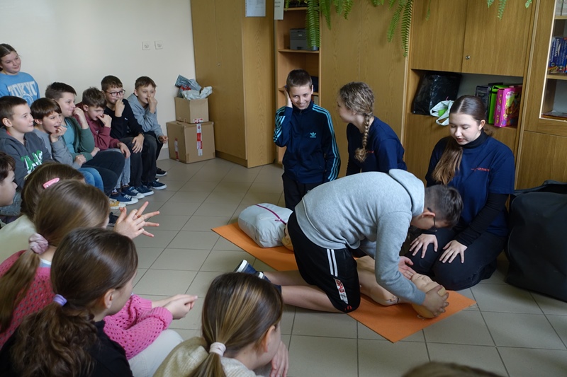 Znajomość podstawowych zasad pierwszej pomocy jest bardzo ważna. Nigdy nie wiadomo, kiedy każdy z nas może znaleźć się w sytuacji, która wymaga szybkiej reakcji. Warto być przygotowanym i wiedzieć, jak postępować w nagłych przypadkach. Na zaproszenie opiekuna szkolnego koła PCK bardzo chętnie odpowiedziała grupa wolontariuszy- uczniów klasy trzeciej Liceum Ogólnokształcącego im. Marii Skłodowskiej – Curie w Starym Sączu, która wraz ze swoim opiekunem, przyjechała do naszej szkoły, aby podzielić się wiedzą i doświadczeniem z zakresu pierwszej pomocy przedmedycznej. Nasi eksperci w dziedzinie udzielania pierwszej pomocy, w sposób bardzo interesujący dla uczniów, pokazali, jak szybka reakcja w nagłych przypadkach, np. zadławienie, oparzenie, krwotok, skaleczenie, czy omdlenie może znacząco zwiększyć szanse na przeżycie. Przedstawili podstawowe techniki pierwszej pomocy, takie jak resuscytacja krążeniowo-oddechowa, opatrywanie ran, sposób postępowania przy krwawieniu z nosa, czy też oparzeniu, które są nieocenione dla ratowania ludzkiego zdrowia, a nawet życia. Uczniowie mieli też okazję sprawdzić nabyte umiejętności na miejscu, gdzie ratownicy- wolontariusze przygotowali punkty zadaniowe.