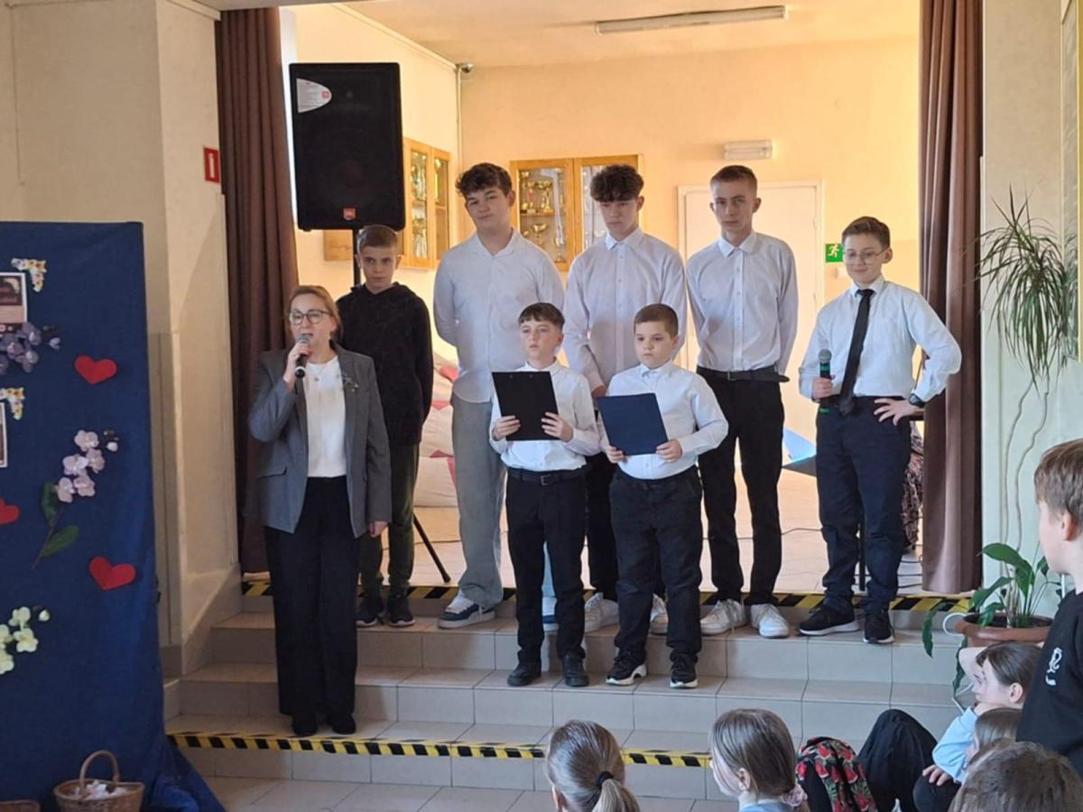 W dniu 6 marca w naszej szkole obchodziliśmy Dzień Kobiet. Z tej okazji męska część Rady Samorządu Uczniowskiego przygotowała krótki apel dla wszystkich Pań i koleżanek. Młodsi chłopcy przedstawili scenkę, jak w zabawny sposób można przygotowywać się na ten szczególny dzień, a starsi złożyli życzenia w imieniu całej męskiej społeczności szkolnej wszystkim kobietom i dziewczynom naszej szkoły. Panie zostały obdarowane drobnym upominkiem, a każda dziewczynka słodkościami.