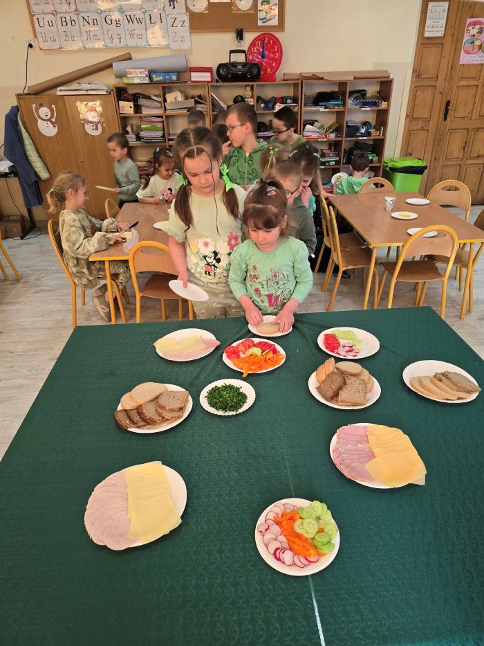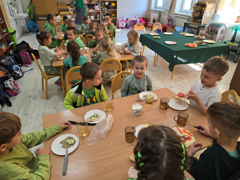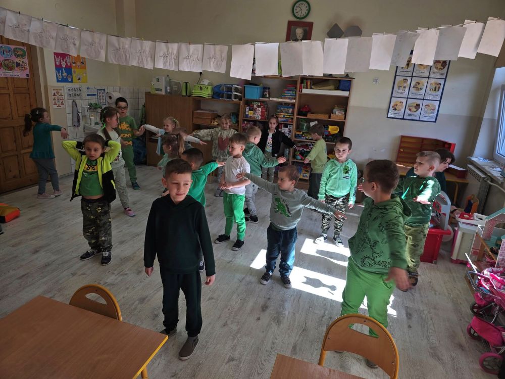 Pierwszy dzień wiosny w oddziale 0-1 był pełen radości i kolorów. Już od rana w sali dominowała zieleń – dzieci ubrane w wiosenne barwy z entuzjazmem przystąpiły do przygotowywania zdrowego śniadania. Na kanapkach układały sery, wędliny i chrupiące warzywa, a całość dopełniała ciepła herbata z miodem i cytryną. Po posiłku czekała na wszystkich prawdziwa dawka ruchu! Starsze koleżanki poprowadziły aerobik i taneczne zabawy, które porwały maluchy do wspólnej aktywności. Śmiech i muzyka wypełniły salę, a energii nie brakowało nikomu. Na zakończenie dnia dzieci z oddziałów 0-1 i 0-2 wyruszyły na spacer, by w tradycyjny sposób pożegnać zimę. Marzanny płonęły, a w powietrzu unosiły się radosne okrzyki: „Marzanno, Marzanno ty zimowa panno, dzisiaj Cię spalamy, bo Zimę żegnamy”. To był dzień pełen niezapomnianych wrażeń.