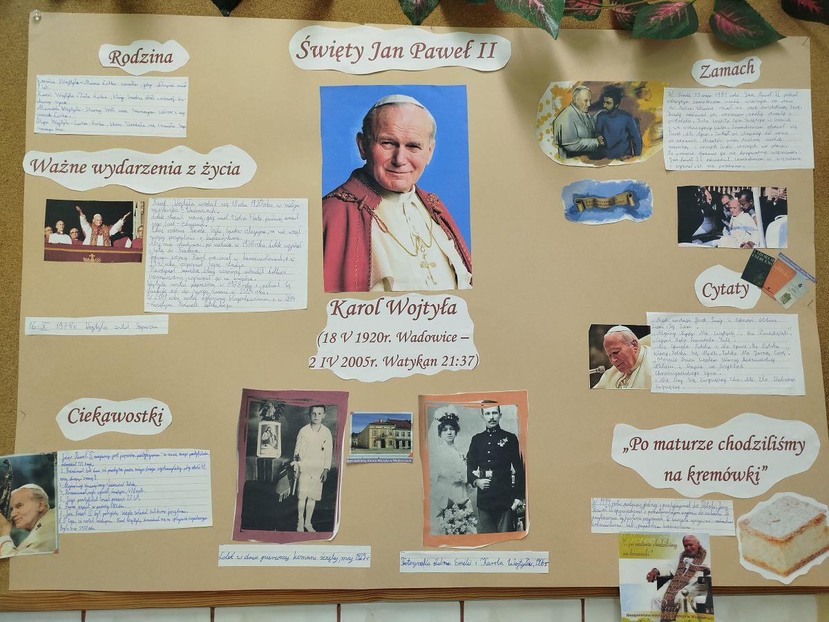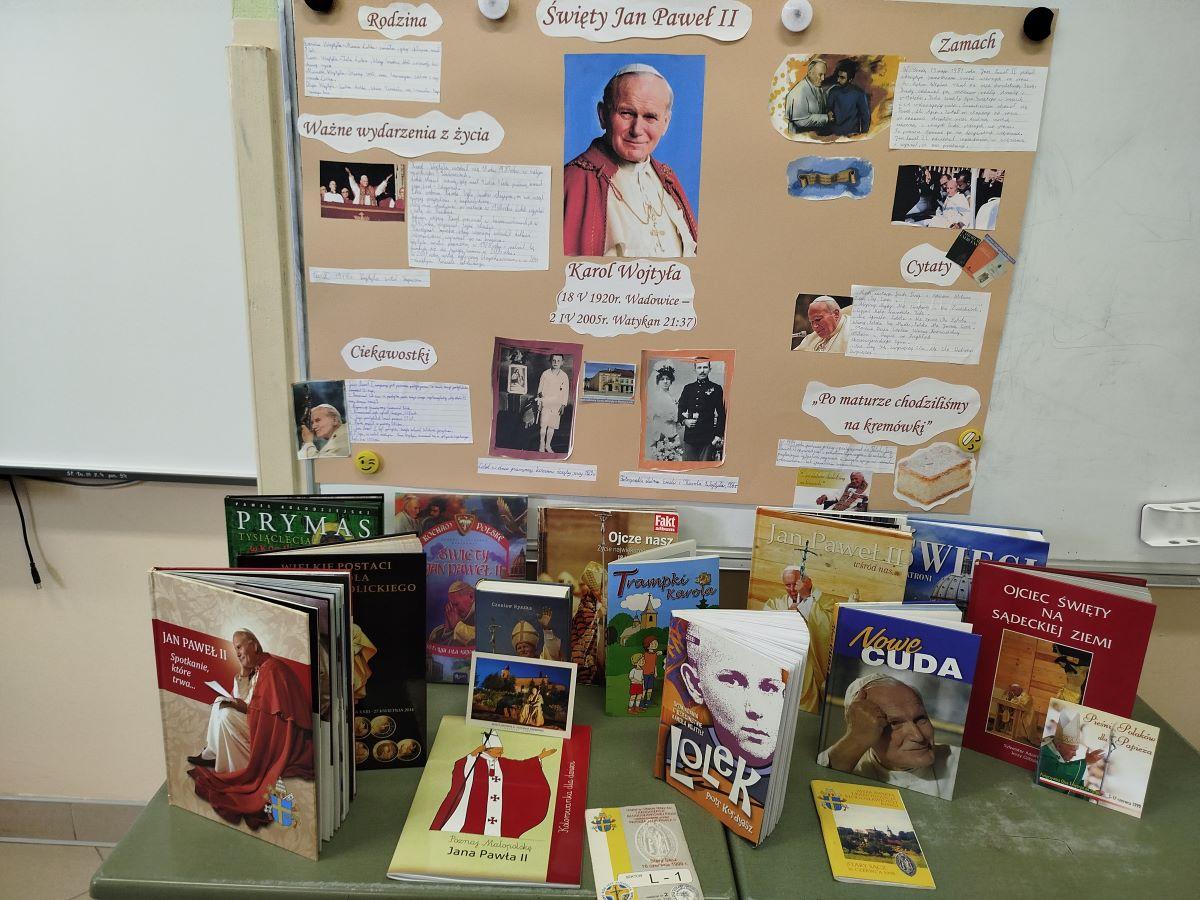 Dla upamiętnienia rocznicy tych wydarzeń uczniowie klasy 3b zapoznali się z książką Piotra Kordyasza „Lolek. Opowiadania o dzieciństwie Karola Wojtyły”, która opowiada o najmłodszych latach Lolka spędzonych w Wadowicach. Porusza tematy bliskie dzieciom takie jak dom rodzinny, szkoła, przyjaźń czy pierwsza komunia święta przyszłego papieża. Dzięki tej lekturze uczniowie poznali także Jego pasje i zainteresowania np.: piłka nożna, wyprawy w góry, teatr czy poezja. Dowiedzieli się również dlaczego papieskie kremówki są takie słynne. Po omówieniu lektury uczniowie oglądali zdjęcia, albumy, fragmenty nagrań filmowych, gdzie zarejestrowano wspomnienia o Janie Pawle II m.in. wybór na papieża, zamach, znane przemówienia i sceny z pielgrzymek, pogrzeb, kanonizacja. Na podstawie zdobytej wiedzy stworzyli plakat o św. Janie Pawle II oraz przygotowali wystawę pamiątek związanych z papieżem i jego wizytą w Starym Sączu 16 czerwca 1999r.