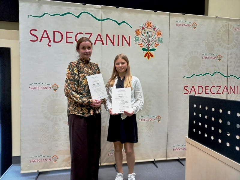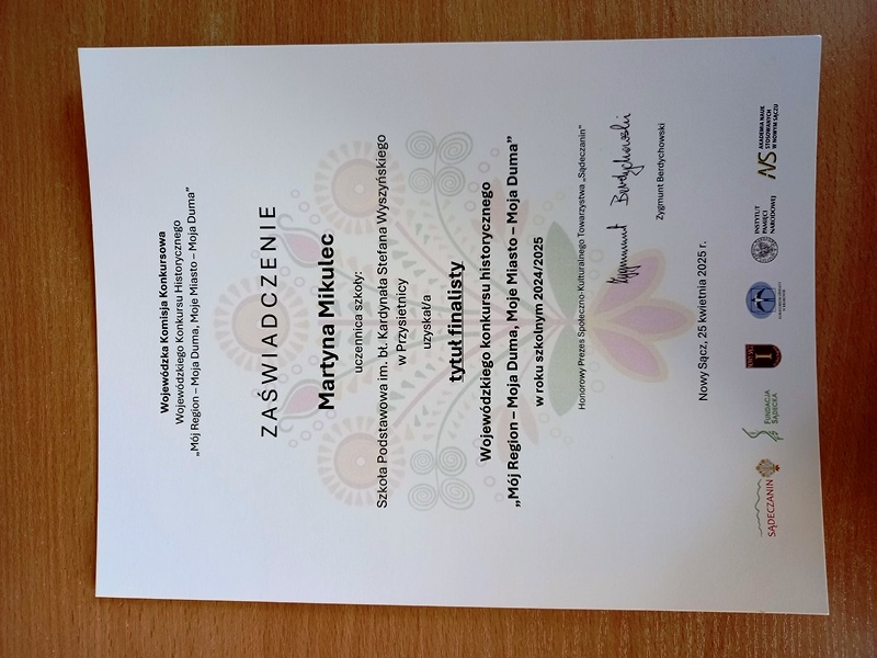 25 kwietnia 2025r. w Akademii Nauk Stosowanych w Nowym Sączu odbył się finał XII edycji Wojewódzkiego Konkursu Historycznego „Mój Region – Moja Duma, Moje Miasto – Moja Duma”, w którym brała udział reprezentantka naszej szkoły Martyna Mikulec z klasy VII.