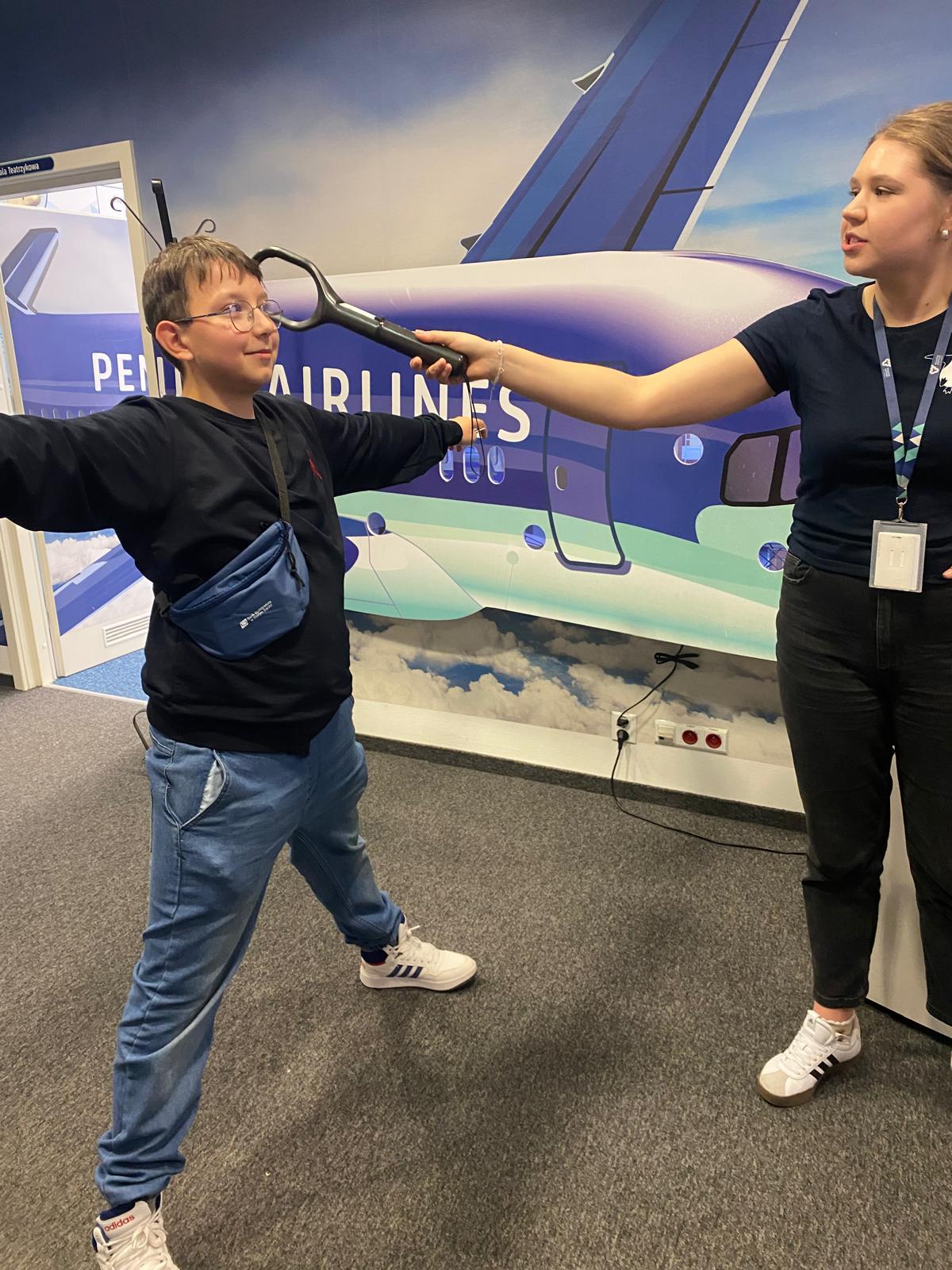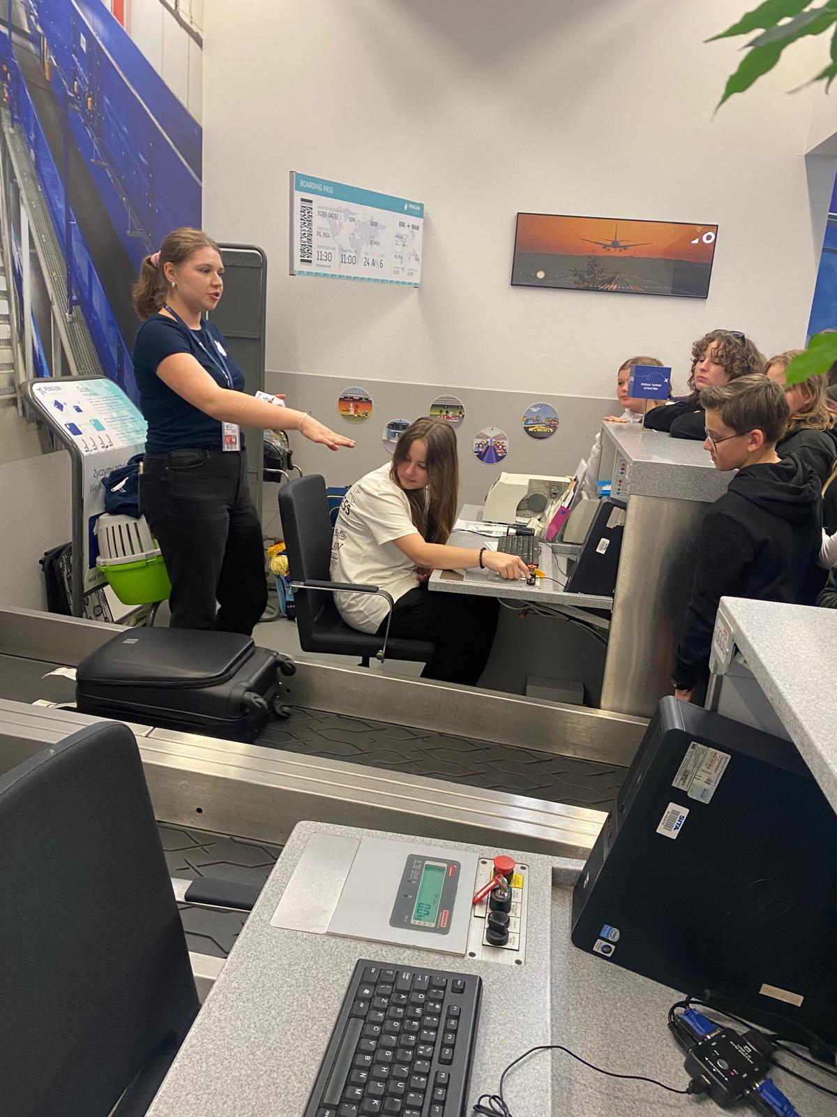 Po historycznych zagadnieniach przyszedł czas na wizytę w Centrum Edukacji Lotniczej, Dzięki interaktywnym stanowiskom uczniowie mogli poznać cały proces podróży lotniczej – od prześwietlania bagażu, przez kontrolę bezpieczeństwa, aż po zajmowanie miejsc w samolocie. Zajęcia pozwoliły zrozumieć, jak funkcjonuje lotnisko oraz jak wygląda ścieżka przylotu i odlotu pasażera. Dużym zainteresowaniem cieszył się również taras widokowy, gdzie uczniowie obserwowali z bliska starty i lądowania samolotów. W trakcie zwiedzania trzy osoby miały okazję skorzystania z symulatora lotu.