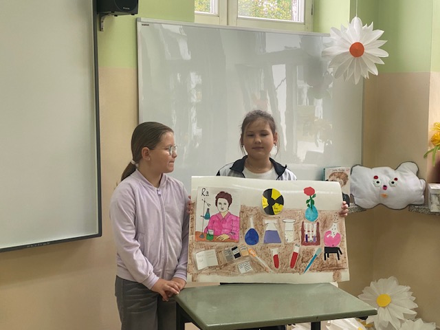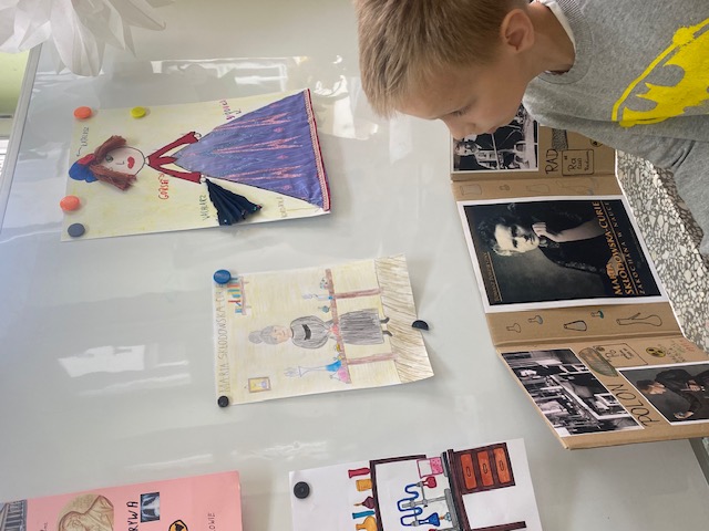 - Uczniowie głośno czytali kolejne rozdziały książki. Następnie wzięli udział w rozmowie kierowanej na temat głównej bohaterki – Marii Skłodowskiej-Curie. Rozmawiali o jej dzieciństwie, zainteresowaniach, trudnościach, jakie musiała pokonywać i o jej ogromnej odwadze i determinacji.