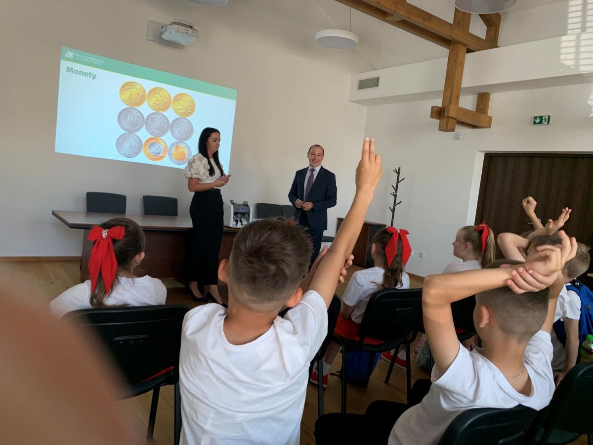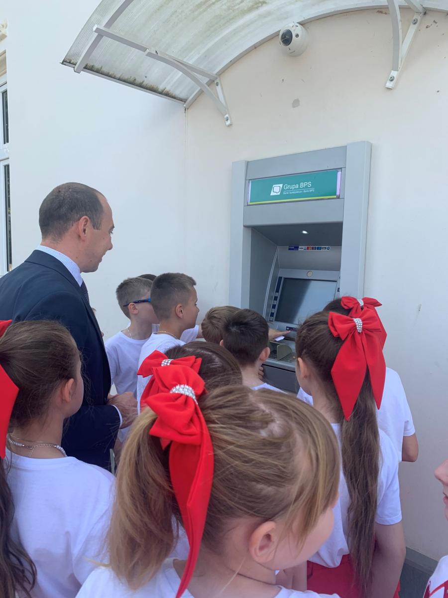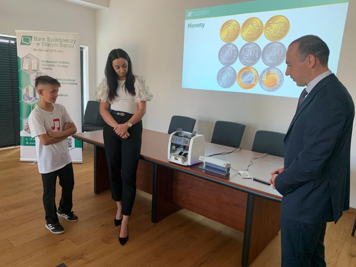 5 czerwca uczniowie klasy IIIa odwiedzili Bank Spółdzielczy w Starym Sączu. Podczas wizyty dzieci miały okazję dowiedzieć się jak wygląda codzienna praca w banku, co robią pracownicy i jak bezpiecznie przechowywane są pieniądze. Uczniowie zostali zaproszeni do sali konferencyjnej, gdzie odbyło się spotkanie z pracownikiem Zarządu, który poprzez prezentację wprowadził dzieci w świat finansów i bankowości. Było przeliczanie banknotów przez specjalne urządzenie, podświetlanie ukrytych znaków wodnych, pokazanie jak działa bankomat oraz zwiedzanie budynku. Uczniowie pilnie słuchali i nabywali nową wiedzę. Zadawali dużo pytań, by zaspokoić swoją ciekawość.