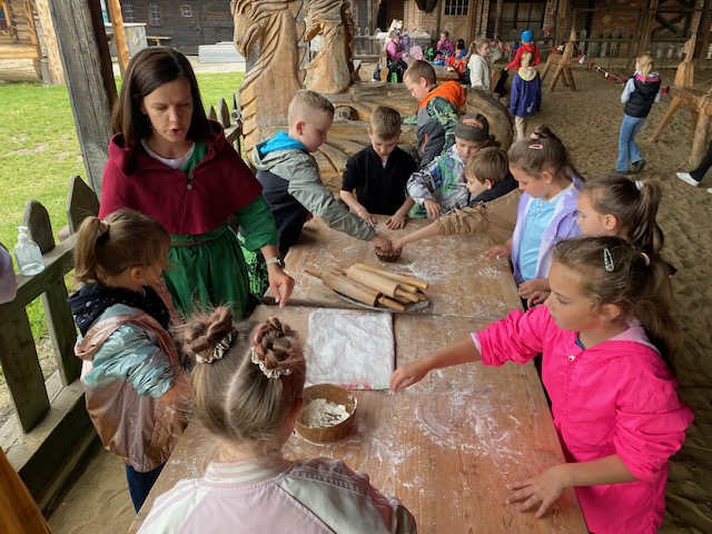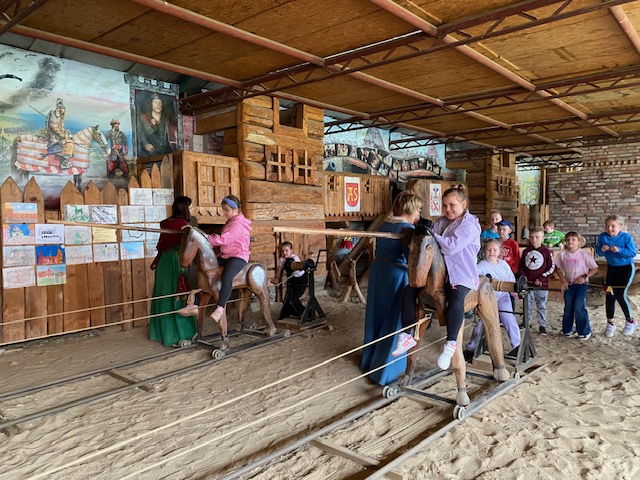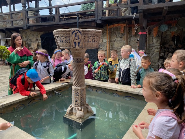 11 czerwca klasy pierwsze udały się na wycieczkę autokarową do Zamku Stara Baśń w Grybowie. Zamek Stara Baśń to rekonstrukcja legendarnego, średniowiecznego grodu warownego, założonego przez Bolka zwanego Gniewnym. To w nim według legendy w 1287 roku zostały rozbite wojska praprawnuka Czyngis-Chana, w czasie najazdów tatarsko – mongolskich na ziemie polskie w XIII wieku. Można tu poczuć klimat czasów naszych pradziadów i atmosferę tamtych lat. A do tego z każdego niemal kąta spoglądają na nas smoki. Dzieci podczas zwiedzania mogły spróbować policzyć potwory - małe i duże. To nie lada wyzwanie, bo smoków jest mnóstwo i sami właściciele już chyba nie wiedzą dokładnie ile 🙂! Główny smok to Grynbos, pięknie wkomponowany w zabudowania grodu! Podczas pobytu w grodzie dziewczynki mogły przemienić się w księżniczki, a chłopcy być pasowanym na rycerza. Służyły temu odpowiednie stroje i rekwizyty. Można było rywalizować w turnieju na kopie, nauczyć się dworskiego ukłonu i innych dworskich manier oraz spróbować wytropić legendarnego smoka. Na koniec dzieci upiekły podpłomyki, które wszystkim smakowały wybornie. Przed wyjazdem pożegnaliśmy Grynbosa oraz zakupiliśmy pamiątki. Wróciliśmy bardzo zadowoleni z wycieczki.
