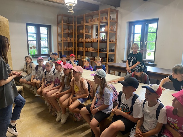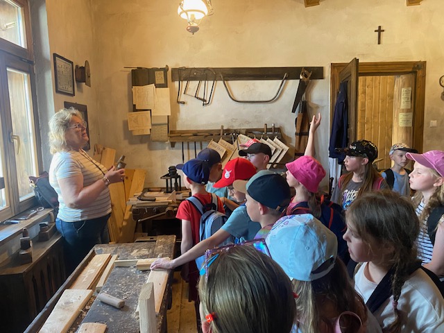 Po przedstawieniu wszyscy pojechaliśmy do Miasteczka Galicyjskiego. Przywitała nas pani przewodnik, która zaprosiła dzieci na zwiedzanie. Miasteczko Galicyjskie to rekonstrukcja małego miasta z przełomu XIX i XX wieku. Dzieci zobaczyły dawną aptekę, sklep kolonialny, szkołę, zakład fryzjerski i wiele innych ciekawych budynków. Dzieci  słuchały opowiadania o życiu codziennym ludzi mieszkających w tamtych czasach. Z zainteresowaniem oglądały dawne przedmioty i narzędzia. Wykazały się również swoją dużą wiedzą, za którą zostały pochwalone. Wycieczka była okazją do poznania życia codziennego mieszkańców Galicji, kształtowania postaw szacunku wobec dziedzictwa kulturowego i historycznego oraz rozwijanie zainteresowań historycznych i regionalnych  u uczniów.