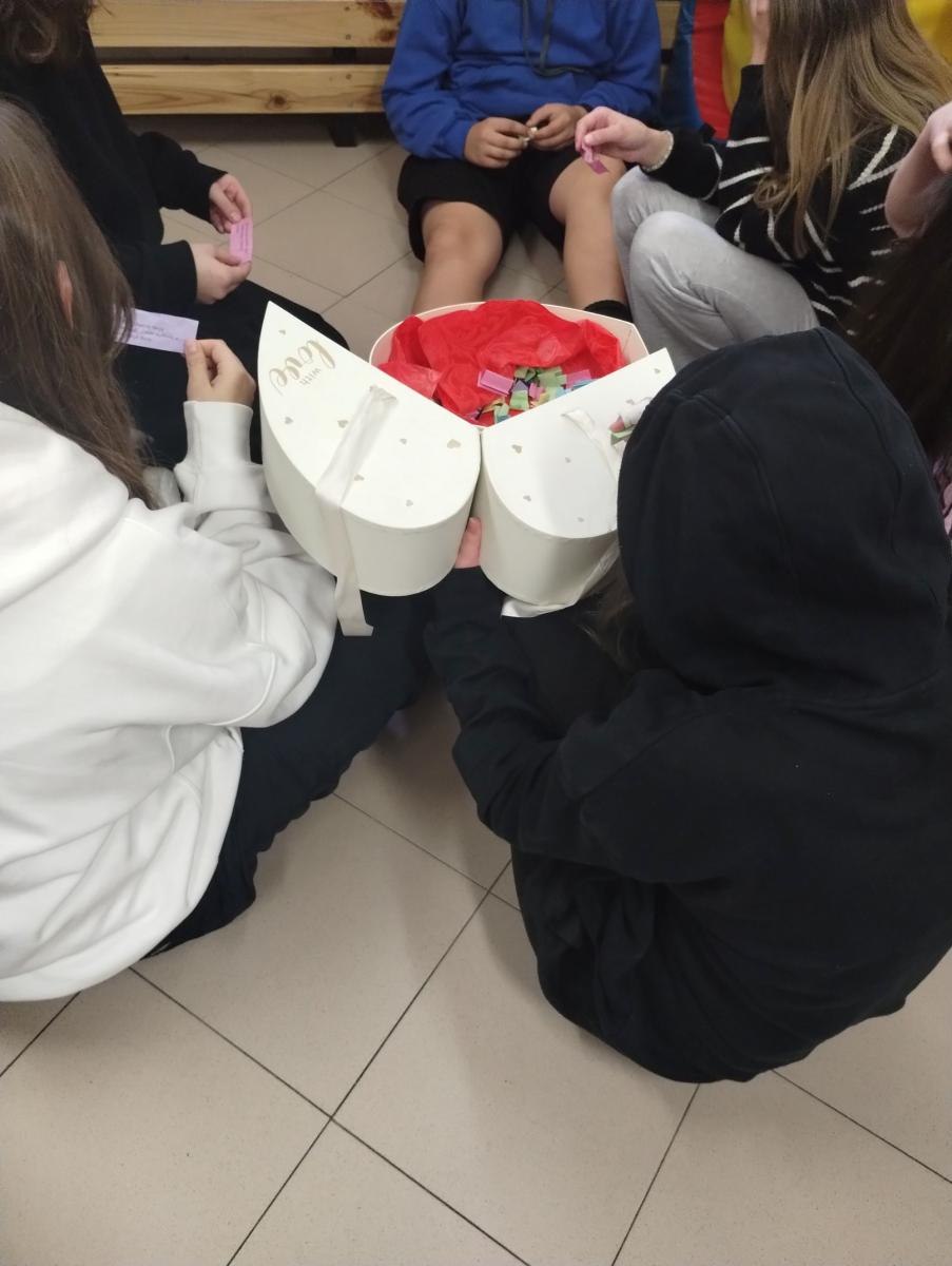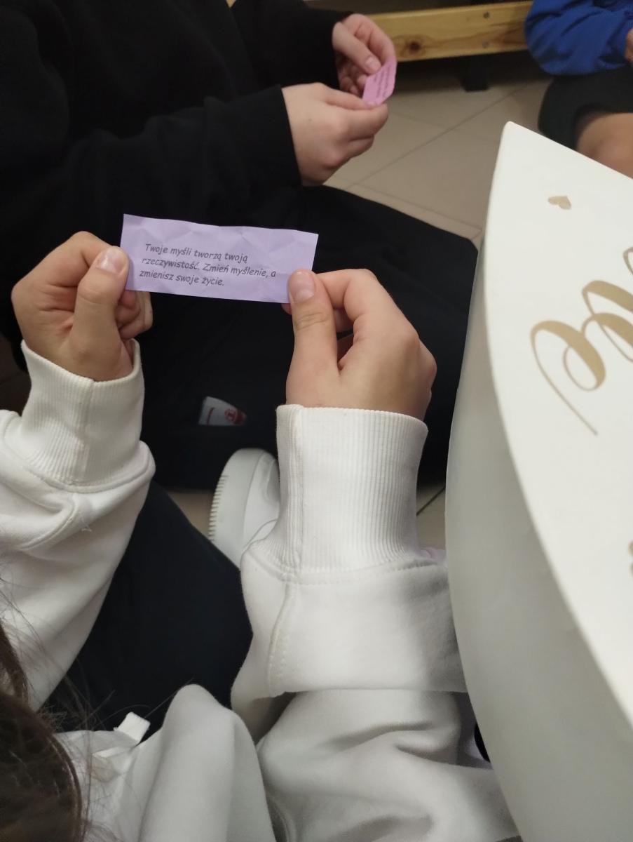 Kolejnym ciekawym elementem była inicjatywa „Pudełko życzliwości”, w której uczniowie mogli losować karteczki z cytatami, inspirującymi myślami i miłymi hasłami. Każdy mógł wziąć jedną kartkę i przekazać ją innym lub pozostawić dla siebie, co wywoływało mnóstwo uśmiechów i pozytywnej energii. To prosty, a zarazem niezwykle skuteczny sposób na codzienne wzmacnianie dobrych relacji w szkole.
