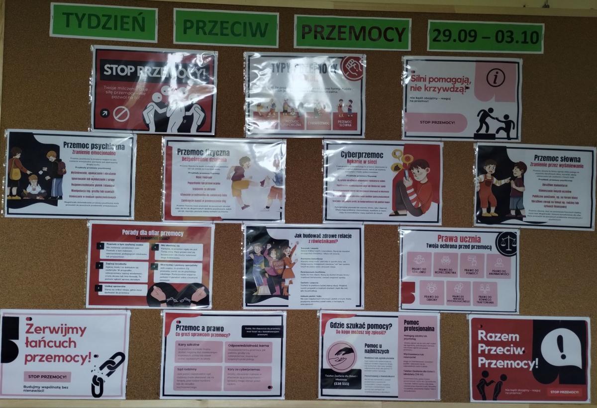 Szkolny korytarz również stał się przestrzenią edukacyjną. Na specjalnie przygotowanej gazetce tematycznej uczniowie mogli przeczytać inspirujące treści i krótkie poradniki, które zachęcały do refleksji nad tym, czym jest przemoc oraz jak każdy z nas może przyczynić się do przerwania „łańcucha przemocy”. Każdy, kto przechodził obok, mógł zatrzymać się na chwilę i zastanowić nad swoim zachowaniem wobec innych.