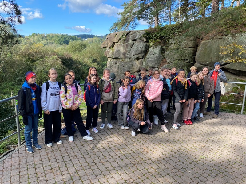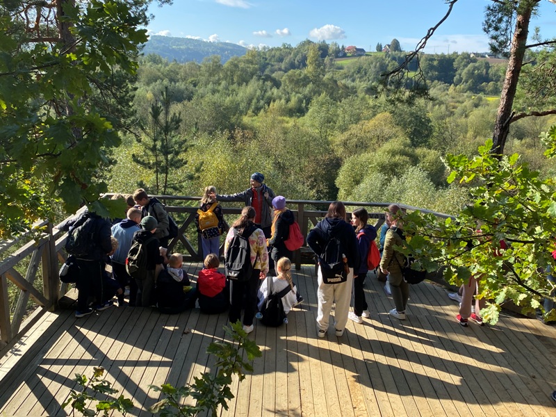 Początkiem jesieni 6 października klasy Va i Vb wraz z wychowawcami p. Iwoną Ogorzały i p. Alicją Nakielską udały się na wycieczkę autokarową do Skamieniałego Miasta – rezerwatu przyrody w Ciężkowicach. W słoneczny poranek na miejscu przywitała nas sympatyczna pani przewodnik, z którą wyruszyliśmy w 4 godzinne odkrywanie miejsca, o którym miejscowa ludność mówiła, że bywa tajemnicze a nawet groźne. Rozrzucone gęsto na stoku wzniesienia skalne przypominające swym kształtem ludzkie lub zwierzęce postacie, związane były z niezwykłymi wydarzeniami, o których z ogromnym entuzjazmem opowiadała nam nasza przewodniczka. Podczas odkrywania niezgłębionych tajemnic rezerwatu nie mogło zabraknąć mini przedstawień w wykonaniu naszych piątoklasistów, obrazujących dawnych rycerzy walczących o królewnę, zamienionych niestety w twarde i zimne kamienie przez złą czarownicę. Łzy opuszczonej przez swych rycerzy księżniczki mogliśmy oglądać schodząc w głąb wąwozu, do którego nawet w słoneczny dzień nie docierają promienie słońca. Na końcu tego mrocznego jaru zobaczyliśmy wodospad – łzy płaczącej dziewczyny kończący szlak aktywnego zwiedzania. Naszej podróży po Skamieniałym Mieście towarzyszyły liczne zagadki, krzyżówki, rebusy, konkursy oraz nagrody dla najaktywniejszych uczestników. Wycieczkę zakończyliśmy w Parku Zdrojowym, gdzie mogliśmy odpocząć wśród ścieżek spacerowych, tężni, pięknych alejek i ogrodów wodnych.