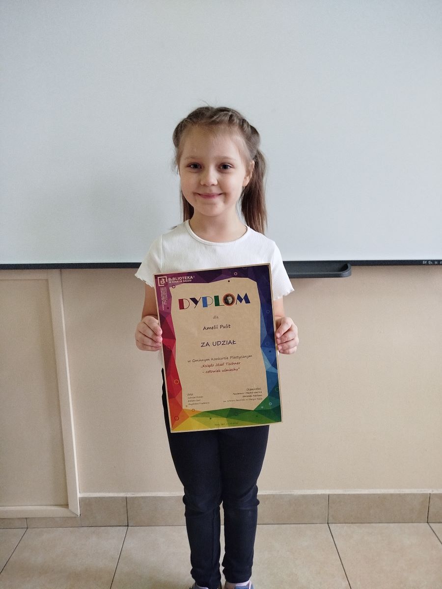 Uczennice klasy 1b Aniela Ogorzały i Amelia Pulit wzięły udział w Gminnym Konkursie Plastycznym „Ksiądz Józef Tischner- człowiek uśmiechu”, którego organizatorem była Powiatowa i Miejsko-Gminna Biblioteka Publiczna im. Wiktora Bazielicha w Starym Sączu. Konkurs został zorganizowany z okazji ustanowienia roku 2025 rokiem ks. prof. Józefa Tischnera. Jury w składzie: Jadwiga Marzec, pisarka, autorka książek dla dzieci i dorosłych, Elżbieta Szot, artystka malarka oraz Magdalena Fryźlewicz, kustosz Muzeum Regionalnego „Dom na Dołkach”, wyłoniły zwycięzców. 17 października podczas Nocy Bibliotek wręczono nagrody uczestnikom konkursu. Uczennica naszej szkoły Aniela Ogorzały zdobyła wyróżnienie. Gratulujemy!