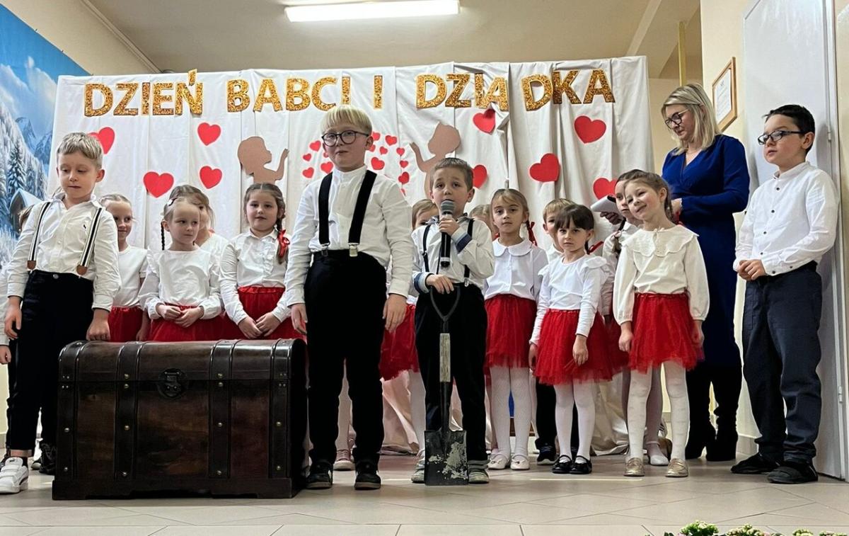 30 stycznia w naszej szkole odbyła się uroczystość z okazji Dnia Babci i Dziadka, przygotowana przez dzieci z oddziału przedszkolnego. Był to dzień pełen radości, uśmiechów i wzruszeń. Przedszkolaki zaprezentowały krótkie przedstawienie o odnalezieniu starej skrzyni ze skarbami z dzieciństwa dziadków. Wydobywane z niej wspomnienia dawnych lat stały się okazją do wspólnego śmiechu. Szczególnie humorystycznym akcentem było „czarowanie” Super Babci i Super Dziadka, które bardzo rozbawiło publiczność. W programie nie zabrakło piosenek oraz krótkiego tańca, przygotowanych specjalnie dla ukochanych Babć i Dziadków. Na zakończenie dzieci wręczyły własnoręcznie wykonane prezenty jako wyraz wdzięczności za miłość i codzienne wsparcie.