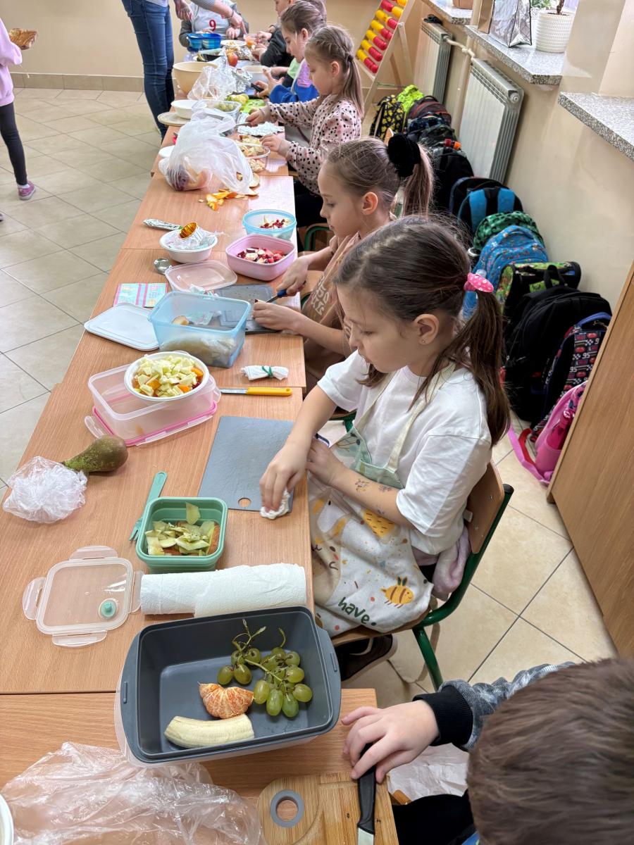 Najwięcej radości sprawiła część praktyczna – przygotowanie sałatki owocowej. Dzieci samodzielnie kroiły owoce, nazywały je oraz omawiały ich walory smakowe i zdrowotne. Była to doskonała okazja do nauki poprzez działanie.