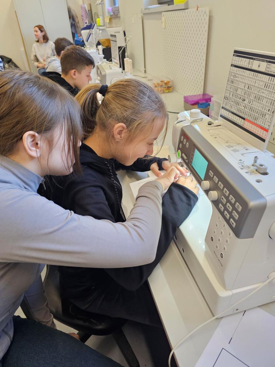 Druga część warsztatów poświęcona była szyciu. Uczniowie poznali podstawowe techniki szycia na maszynie, dowiedzieli się, jak prawidłowo korzystać z igły, nici oraz innych akcesoriów krawieckich. W trakcie zajęć mogli spróbować własnych sił, wykonując proste prace, które wymagały dokładności, cierpliwości i kreatywności.