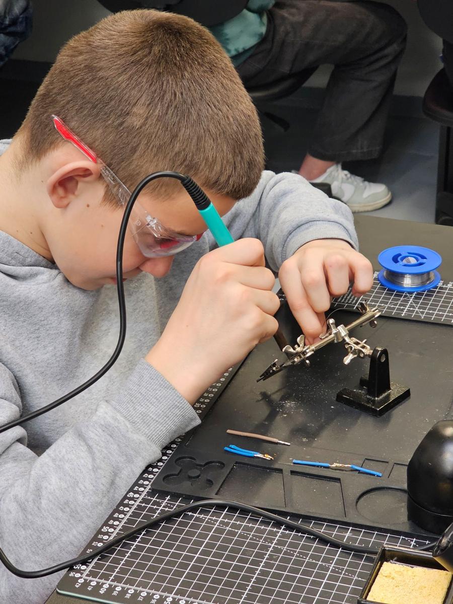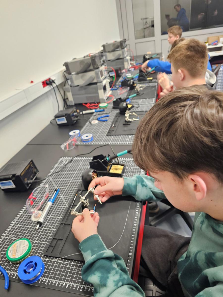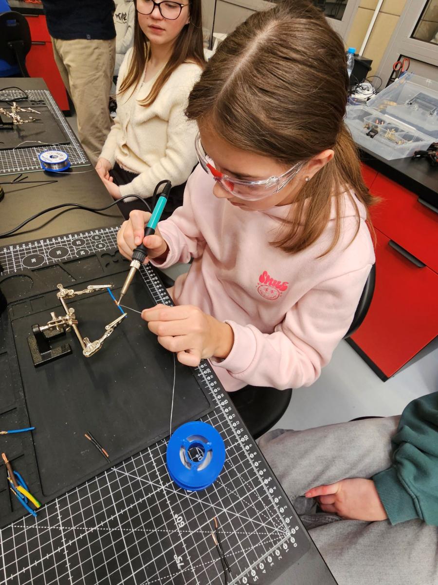 Tematem przewodnim zajęć były dwa różne, ale równie interesujące obszary: lutowanie układów elektrycznych oraz szycie. Podczas pierwszej części warsztatów uczniowie poznali podstawowe zasady działania prostych układów elektrycznych oraz nauczyli się, jak bezpiecznie posługiwać się lutownicą. Pod okiem prowadzących mieli możliwość samodzielnie wykonać proste połączenia elektroniczne, co pozwoliło im zrozumieć, w jaki sposób powstają i działają urządzenia elektroniczne. Dla wielu uczestników było to pierwsze spotkanie z taką formą pracy technicznej, które wzbudziło duże zainteresowanie i ciekawość.